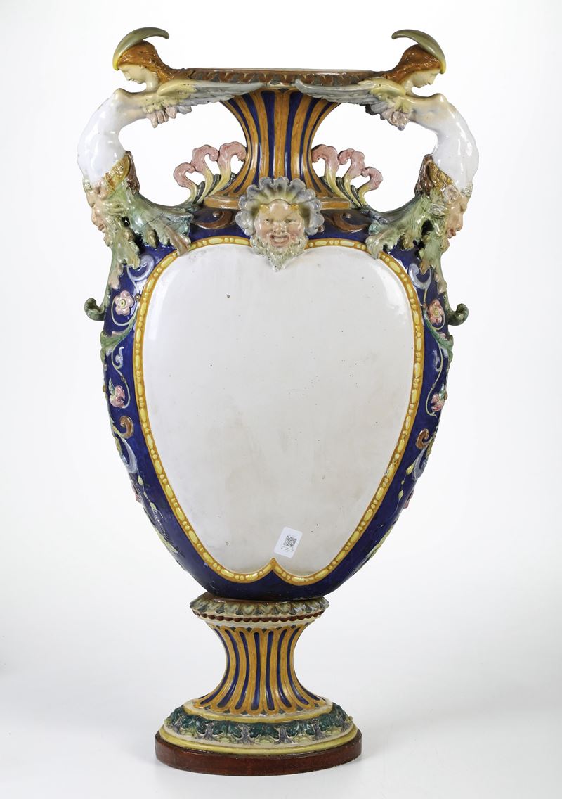Maiolica. Marca: assente. Altezza cm 95,5. Conservazione: restauri alle due arpie delle anse, all’orlo, all’attaccatura del piede, alla parte inferiore del piede; piccole cadute di smalto ai mascheroni