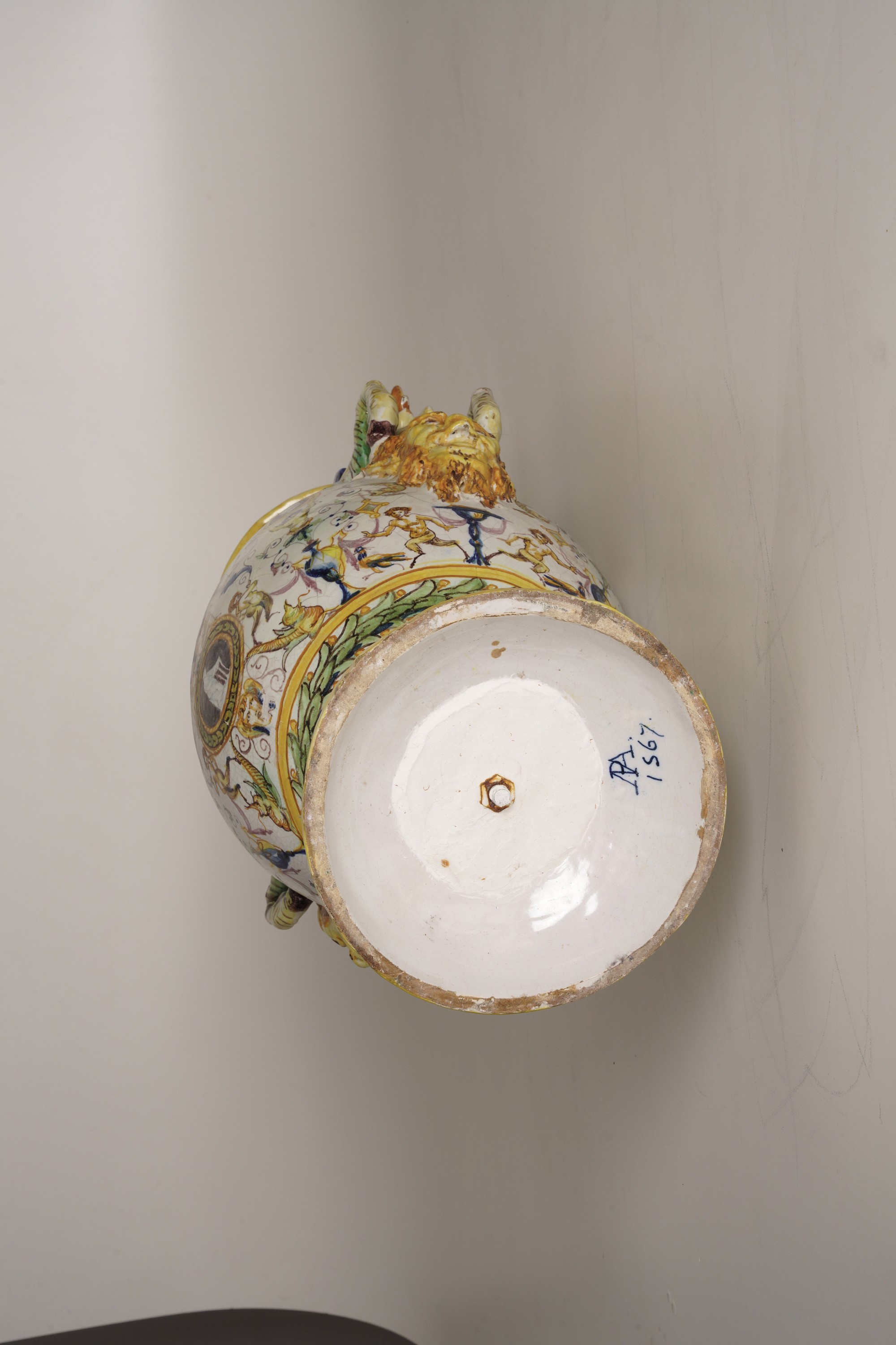 Dal corpo ovoidale con due anse modellate a drago sovrastanti un mascherone, è dipinto con motivi a raffaellesche nello stile della maiolica di Urbino di metà Cinquecento