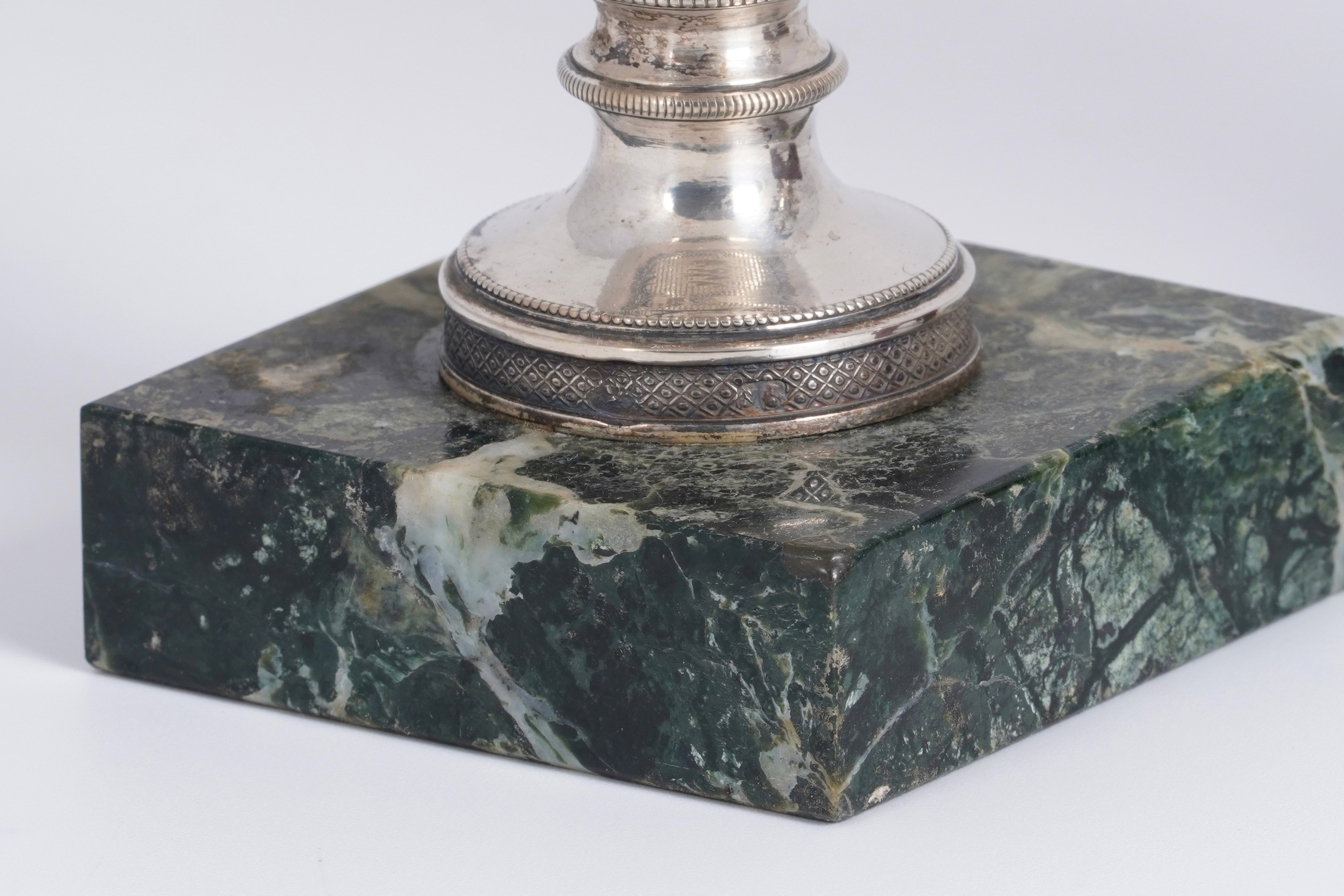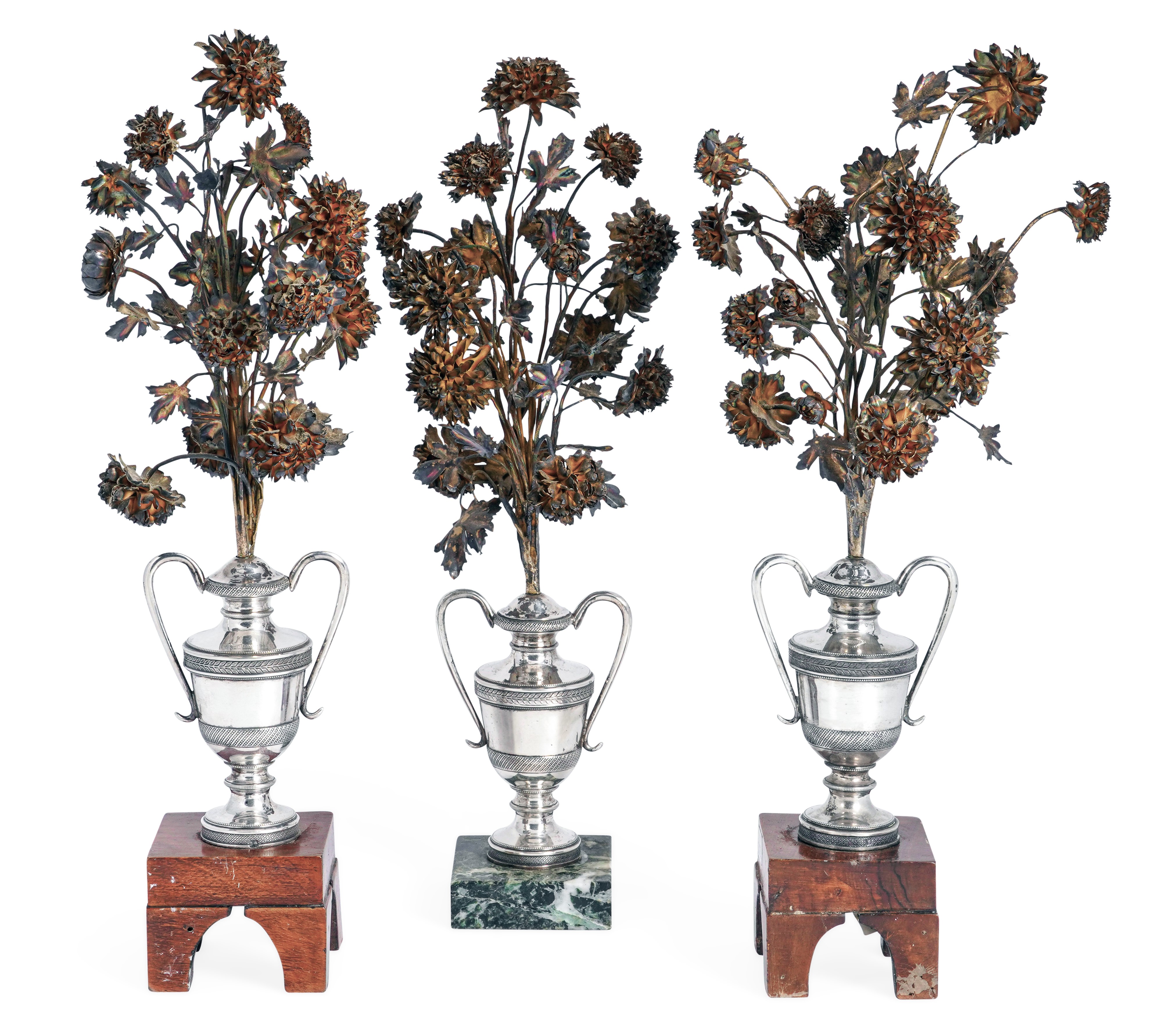 Gruppo di tre portapalme in argento modellati come vasi biansati e tralcio fiorito. Napoli XIX secolo