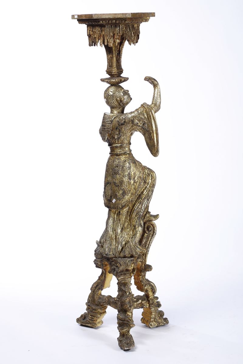figura orientale dagli abiti riccamente intagliati poggiante su sostegno tripode a foggia di roccia, sul capo regge una mensola modanata (mancanze)