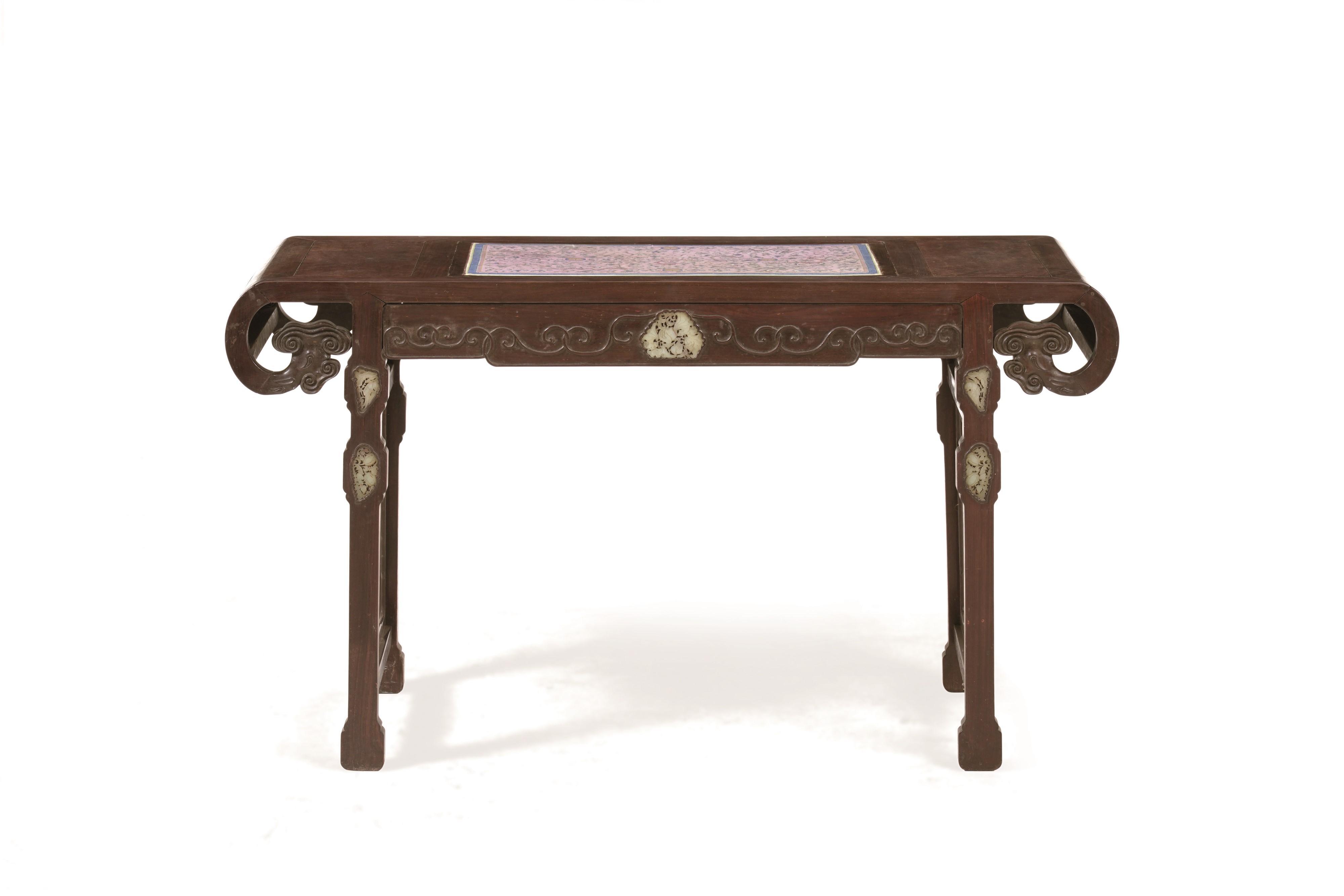 Importante altare in legno di Homu con un inserto di una grande placca in porcellana a decori naturalistici, Famiglia Rosa, Cina, Dinastia Qing, epoca Jiaqing (1727-1820)