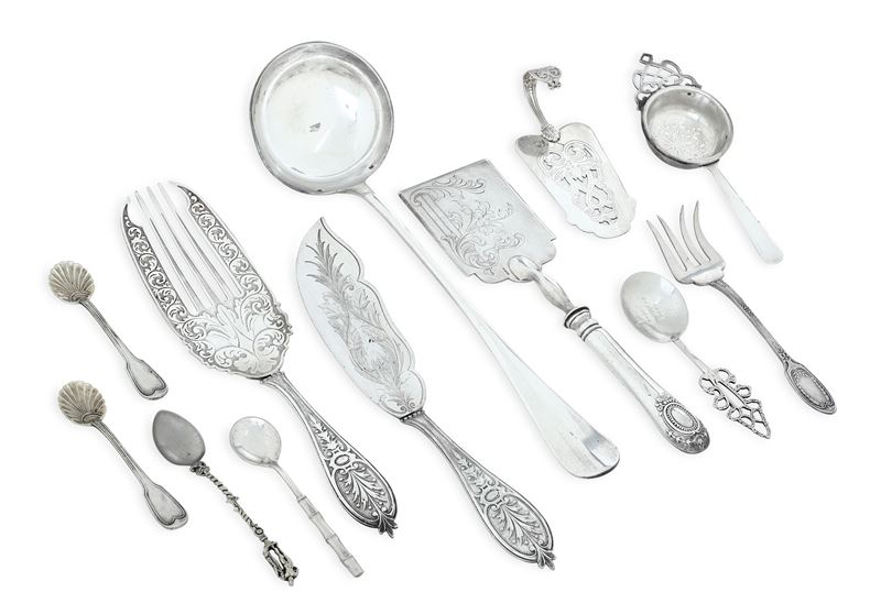 Insieme di posate da servizio in argento e metallo, differenti manifatture del XIX-XX secolo