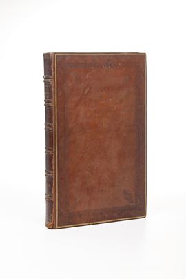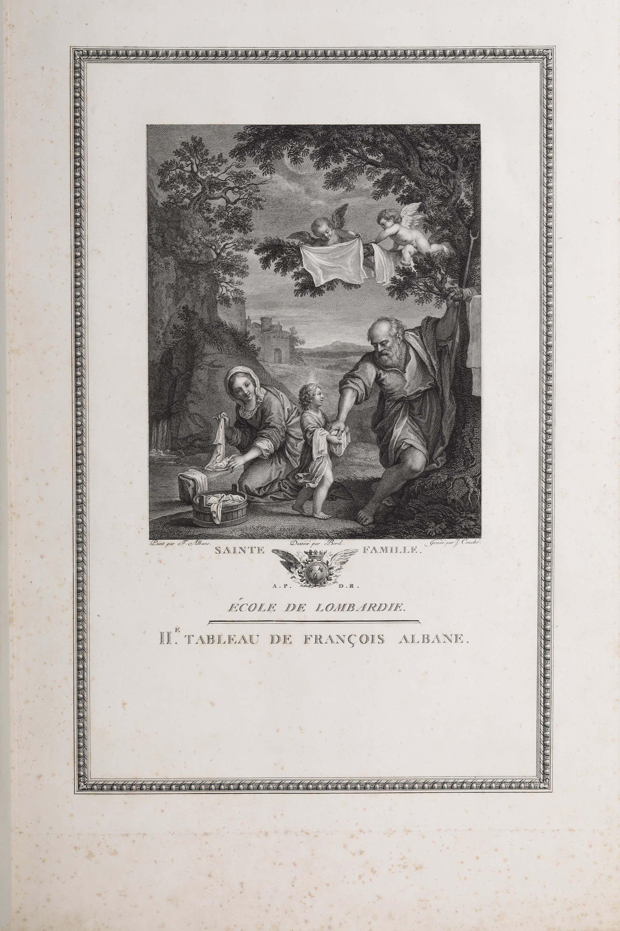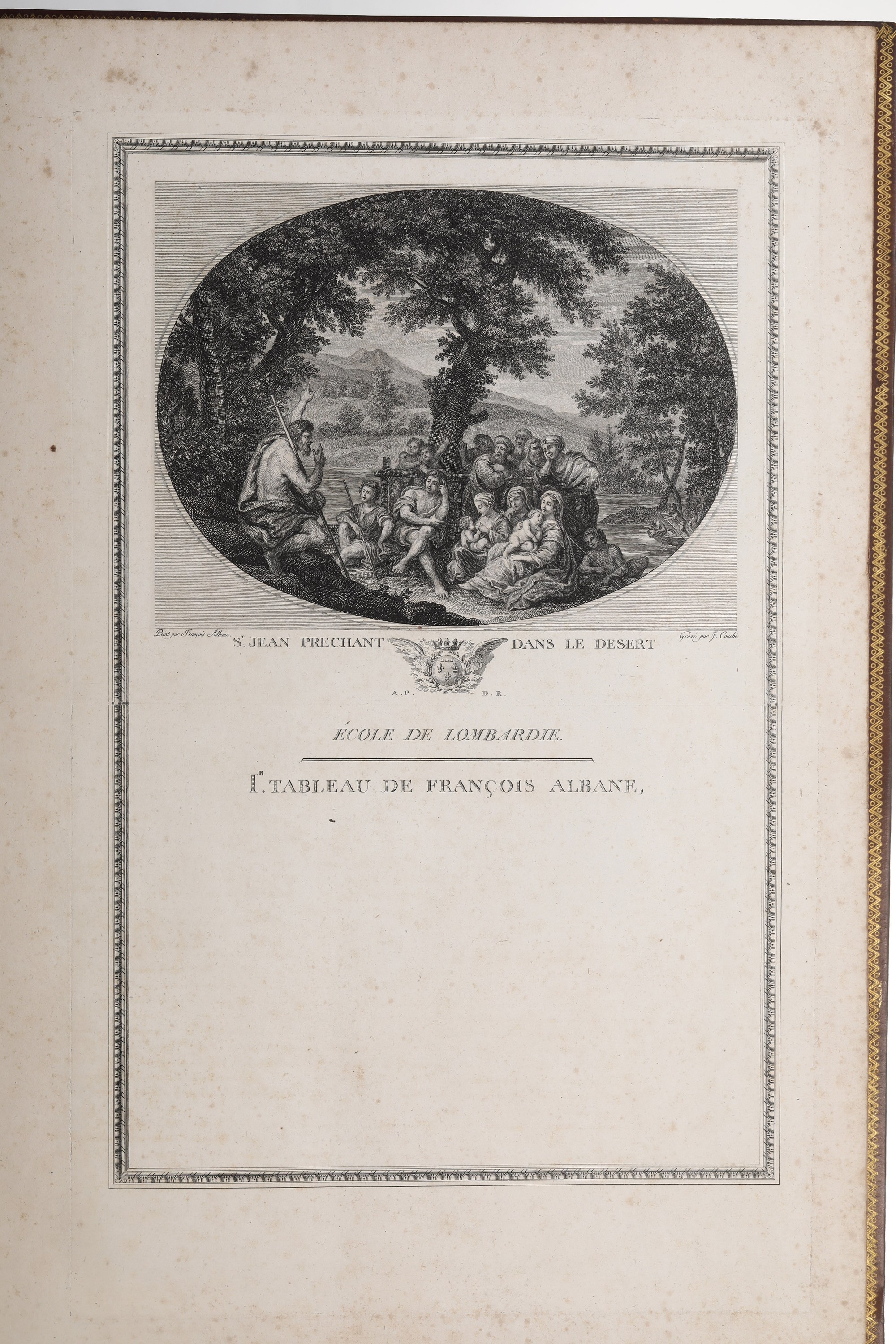 Jean Couche “Galerie du Palais Royal”, solo vol. II. Presumibilmente 1786. In 2°, 520 x 330 mm. Mancante del frontespizio inciso. Dedicatoria al Duc de Orleans con grande stemma sollevato in cielo da due angeli. Raccolta di tavole incise raffiguranti nella parte superiore i vari dipinti, spiegati poi dal testo sottostante. Esemplare molto buono, che presenta alcune fioriture e bruniture. Legatura coeva in piena pelle nocciola con fregi e decorazioni in oro e a secco. Lievi abrasioni e difetti al dorso e ai piatti. Proposto come collezione di stampe incise.