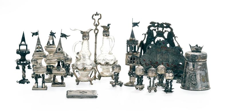 Lotto di oggetti ebraici in argento. XX secolo, vari marchi ad imitazione dell'argenteria russa