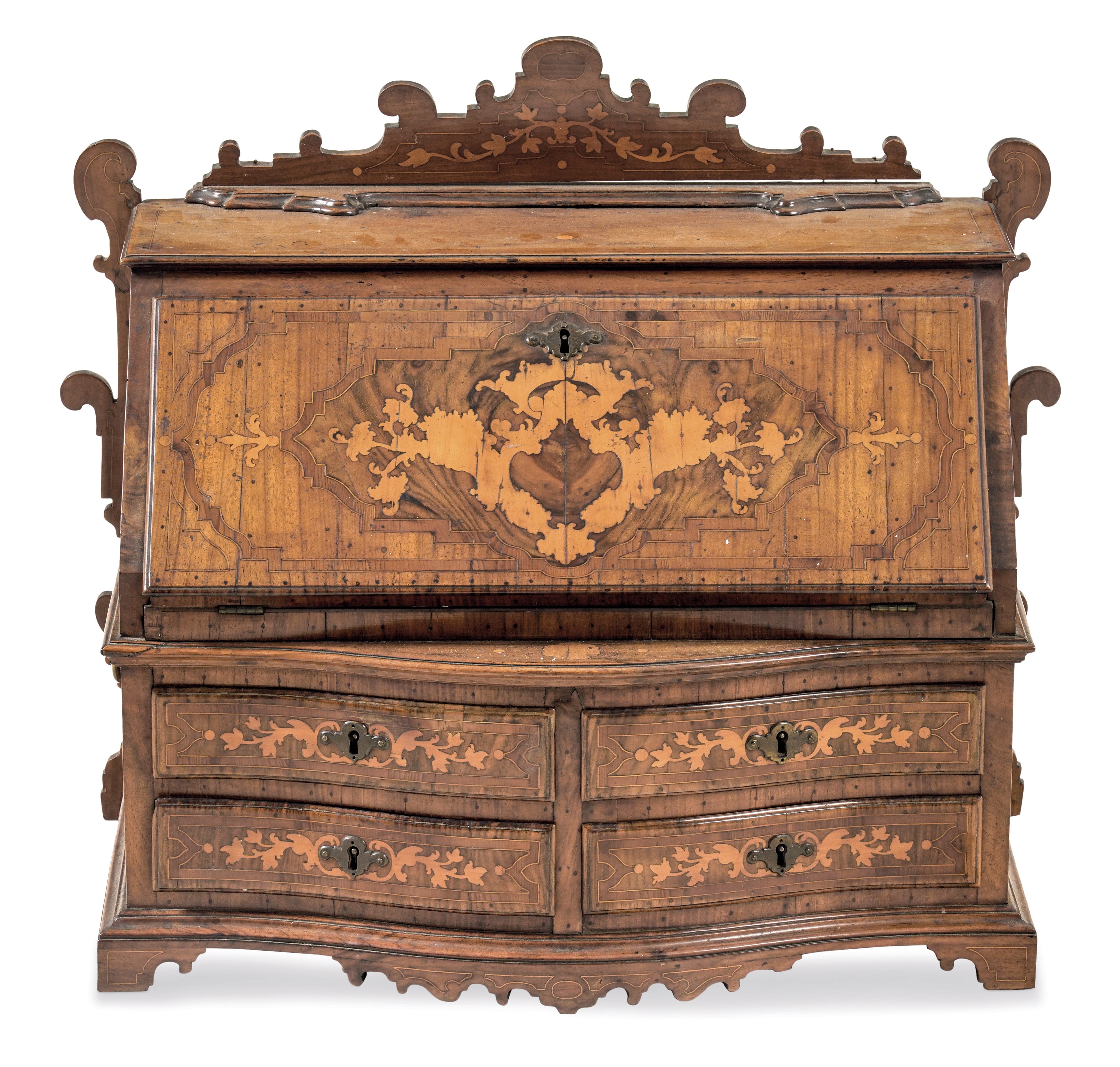 fronte mosso con quattro cassettini e anta ribaltabile, fregi sagomati