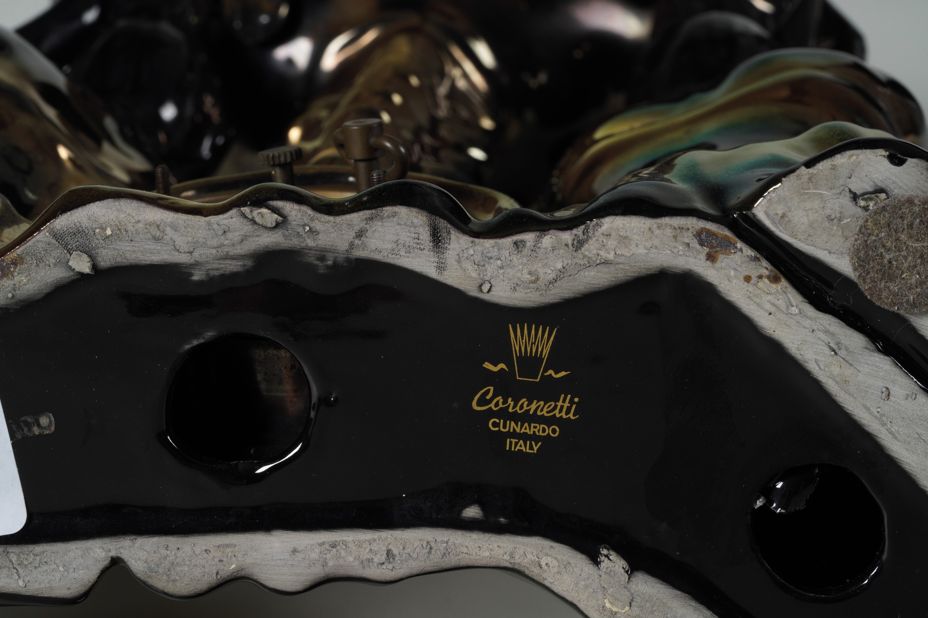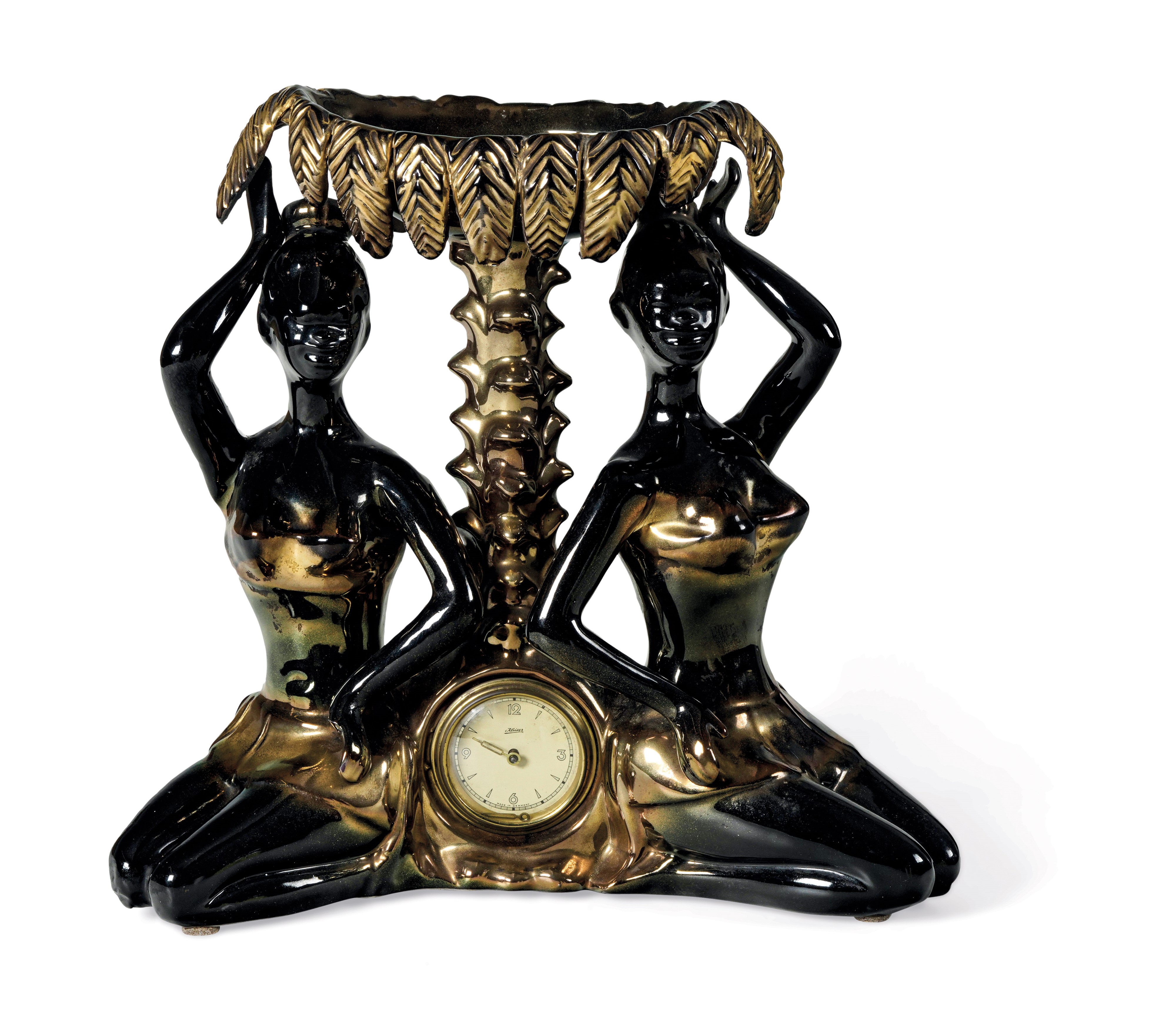 a foggia di figure femminili moresche inginocchiate sotto una palma, marchio sotto la base "Coronetti Cunardo ITALY". Quadrante tondo con numeri arabi firmato "Kaiser, made in Germany"