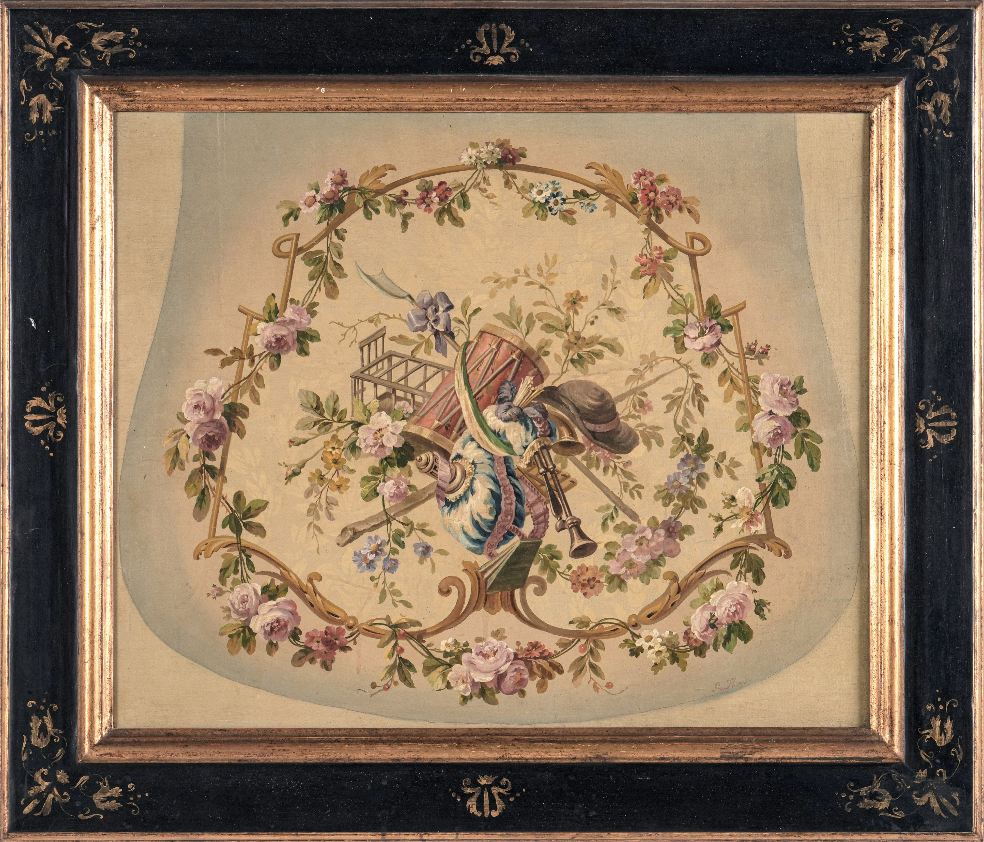 raffigurante trofeo con strumenti musicali circondato da una ghirlanda di fiori