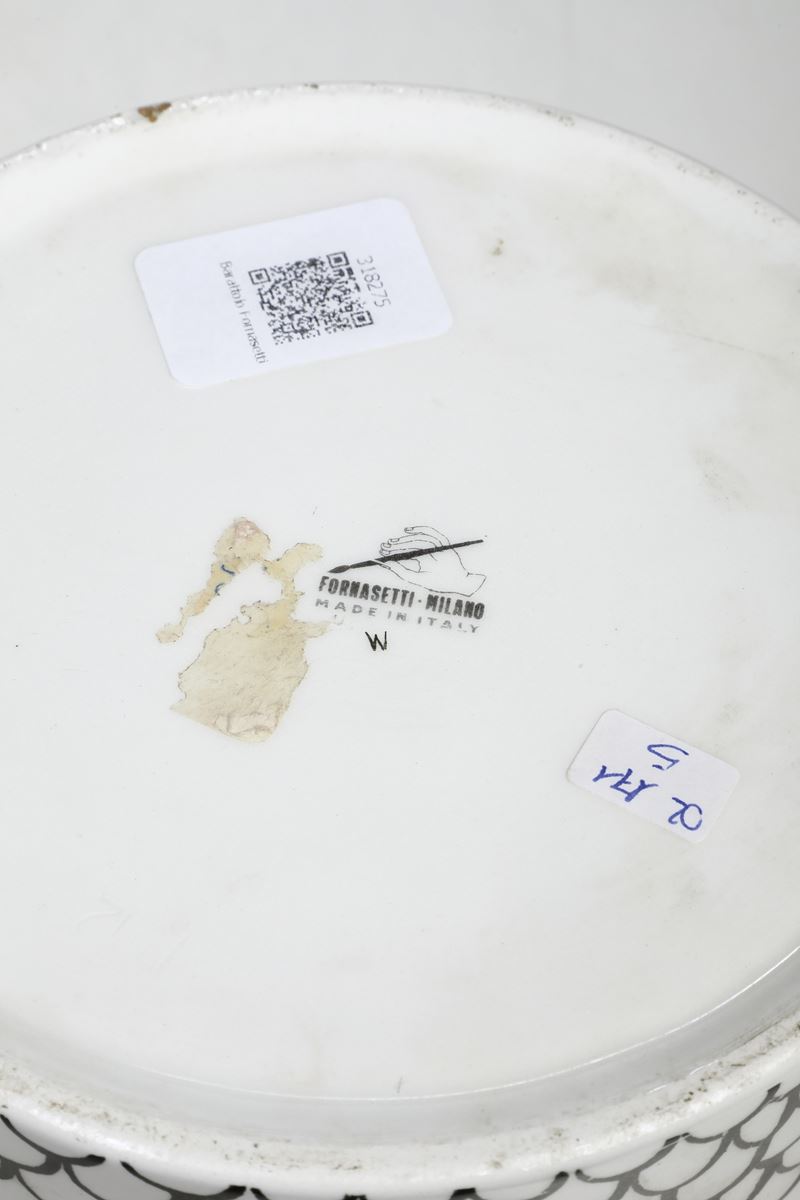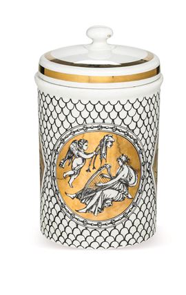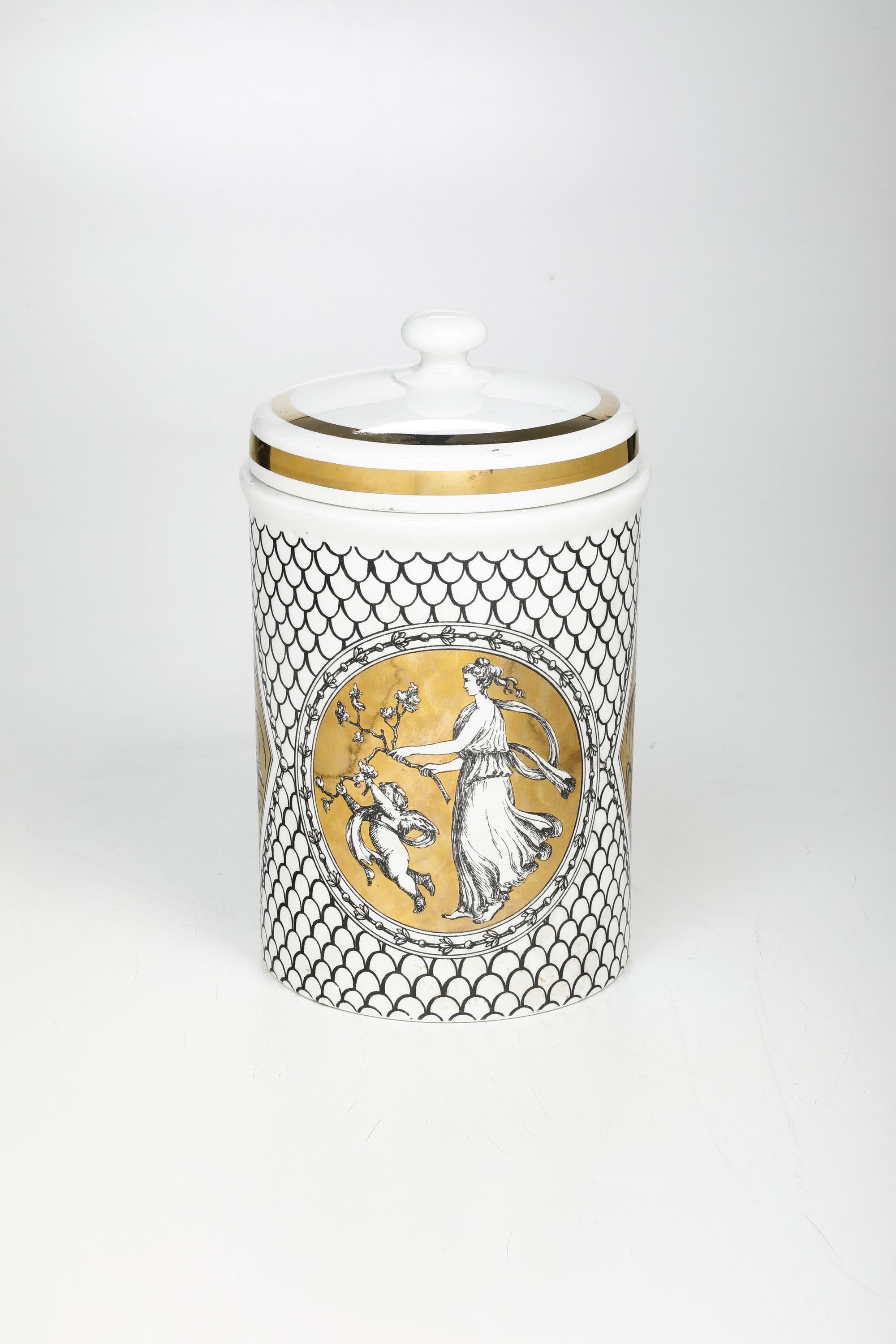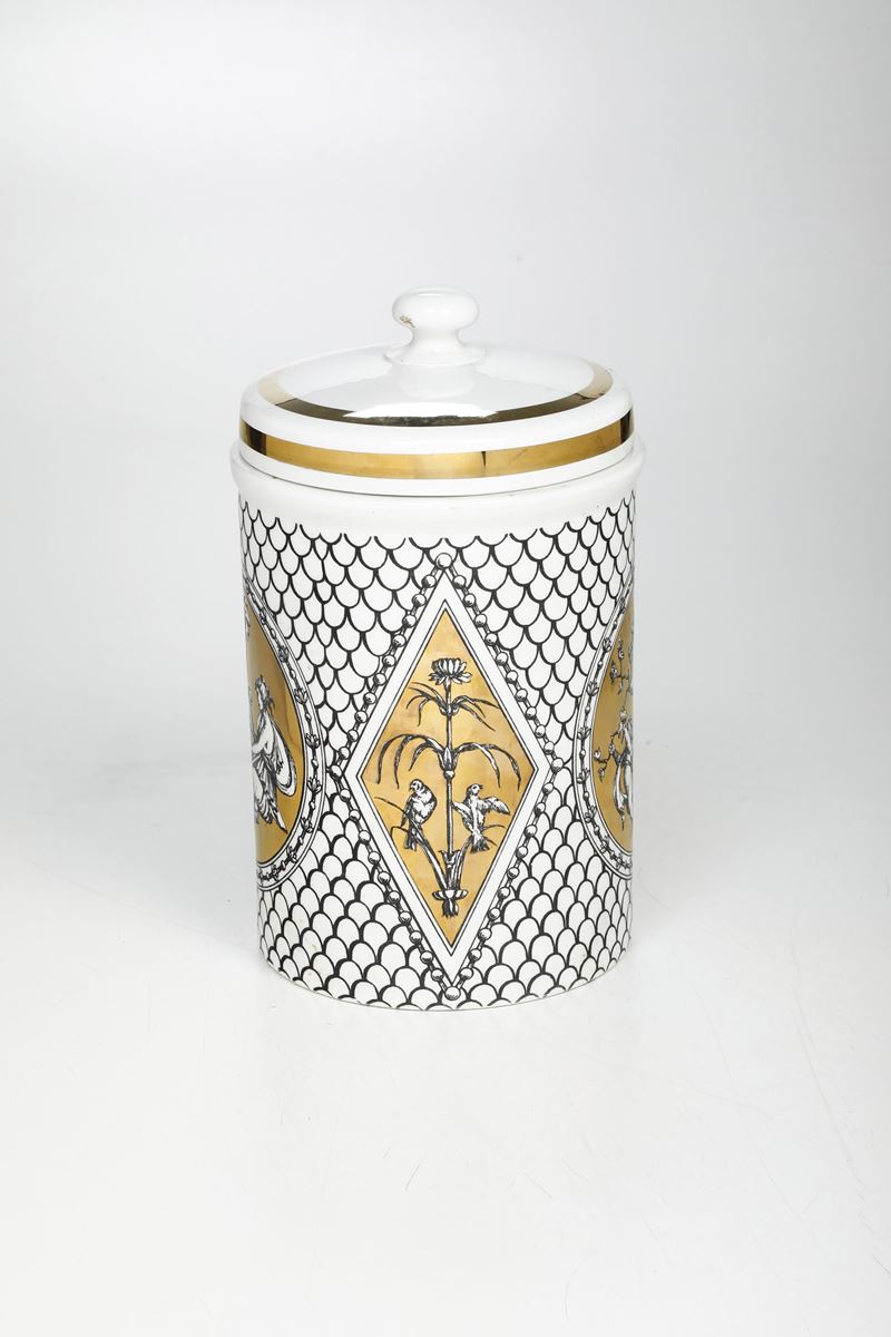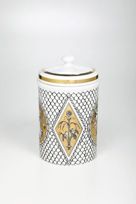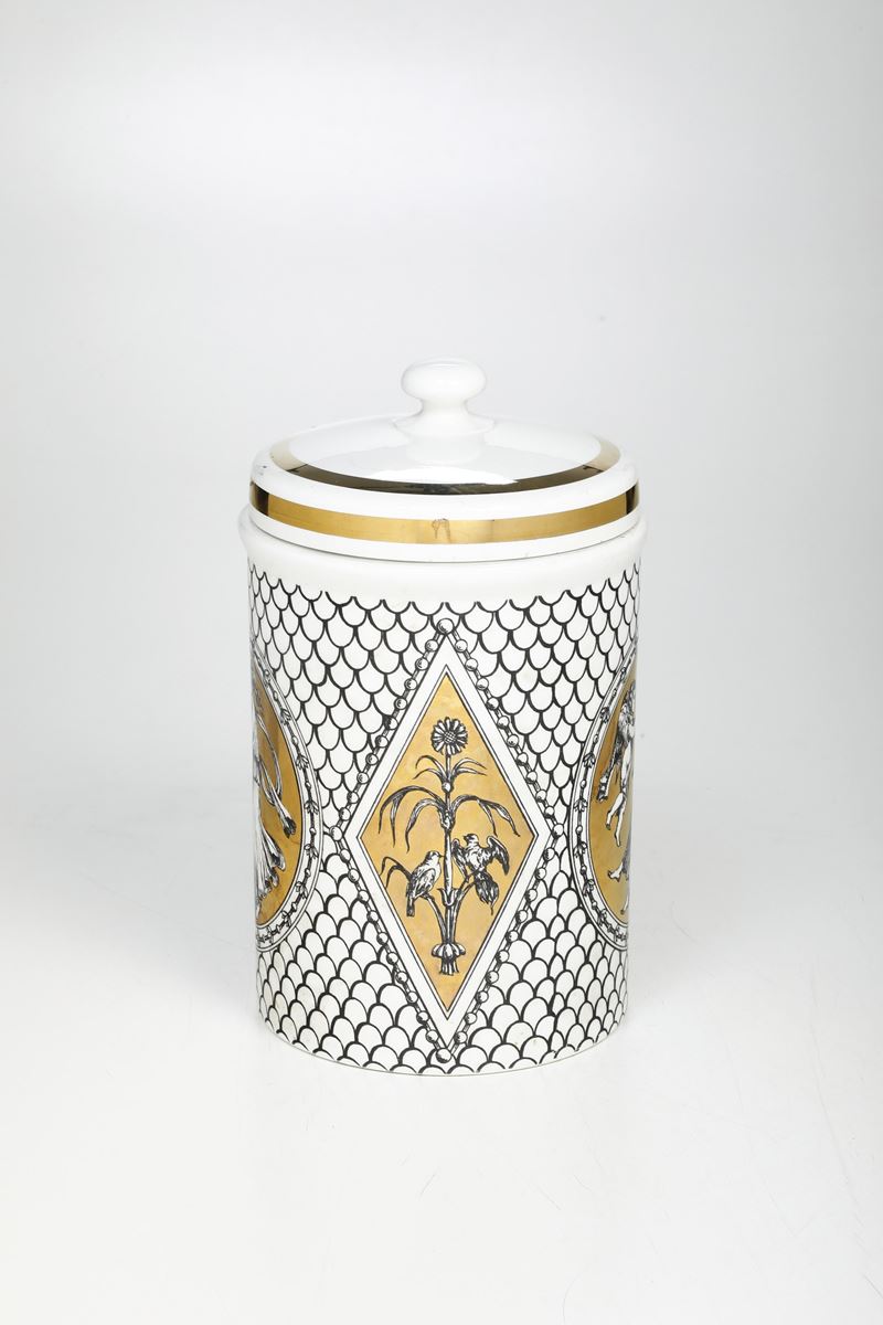 Barattolo con coperchio in terraglia con decoro serigrafato e dorature.