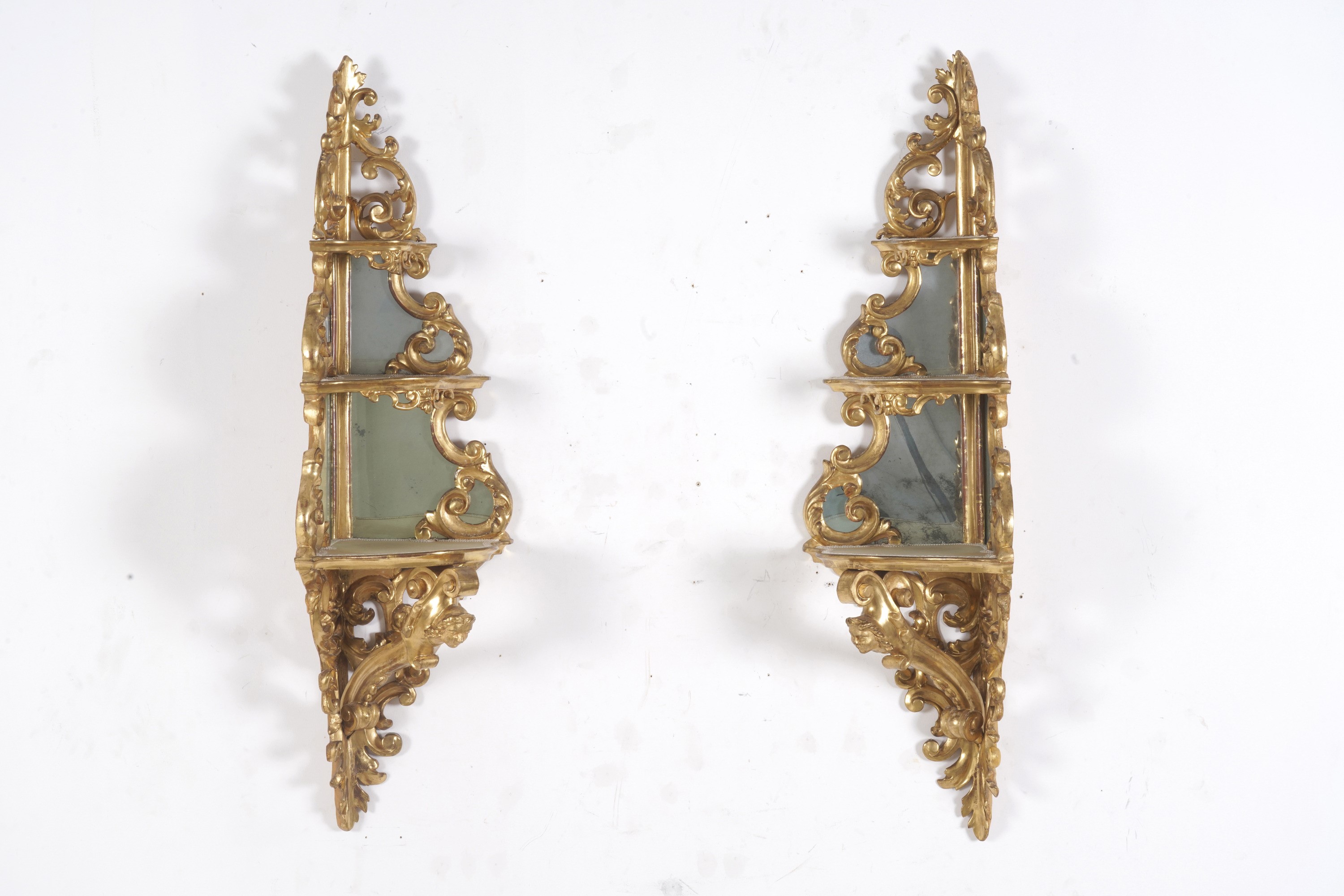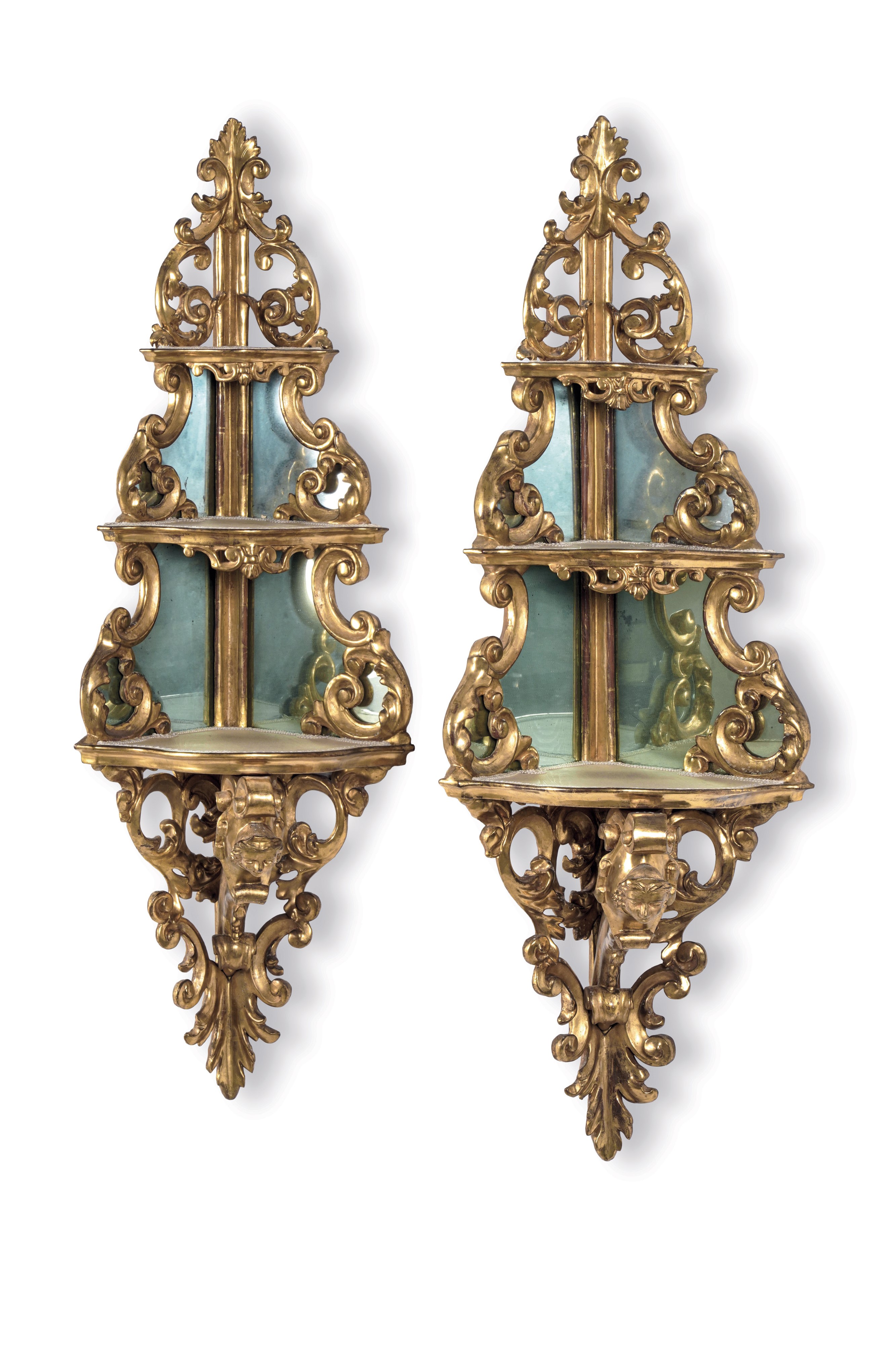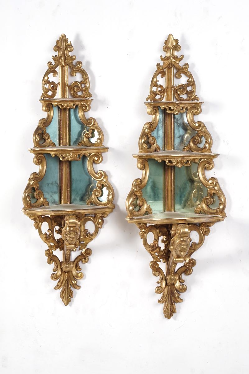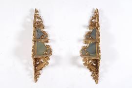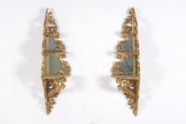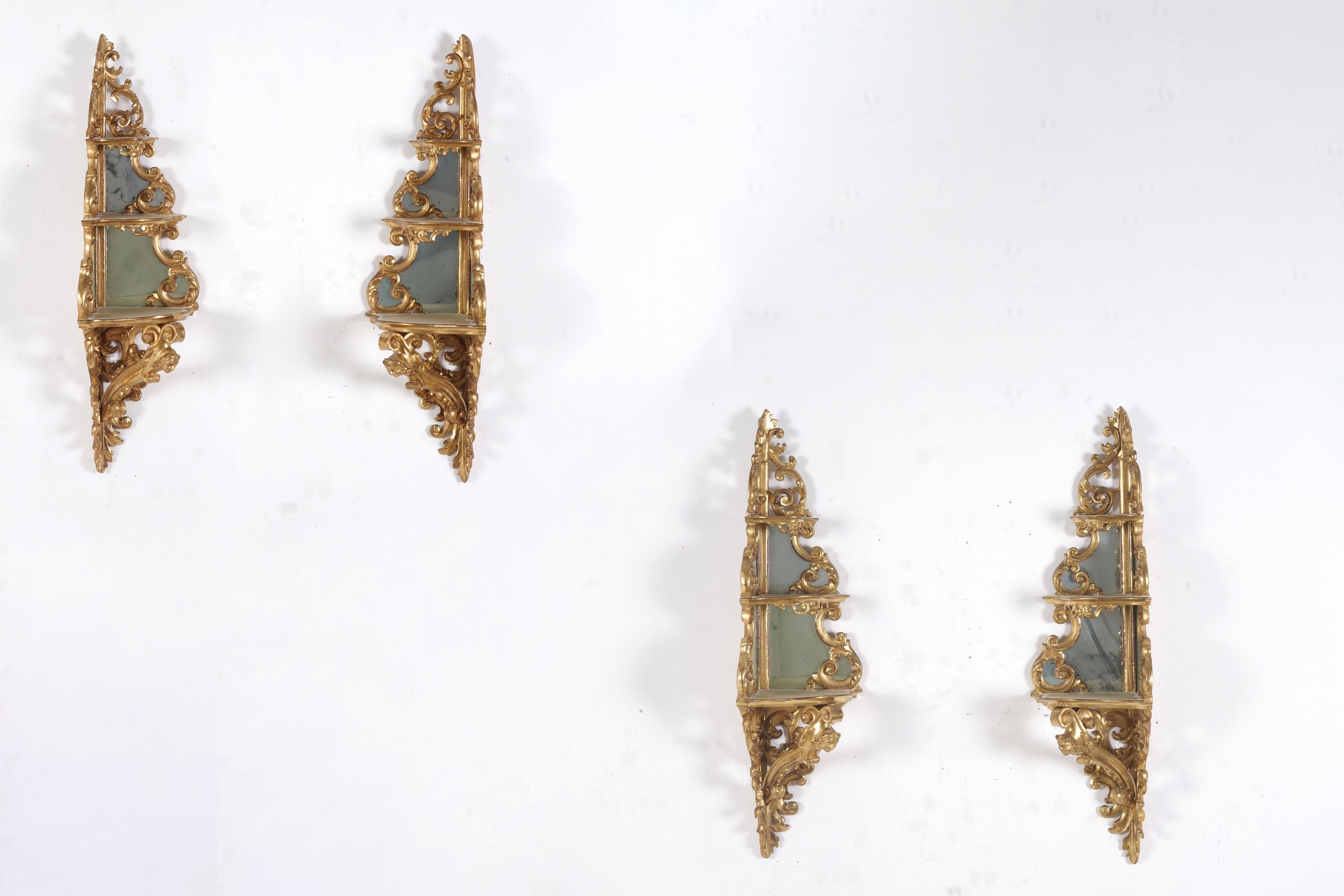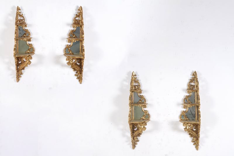 Quattro angolari pensili in legno intagliato e dorato e specchi. XVIII-XIX secolo
