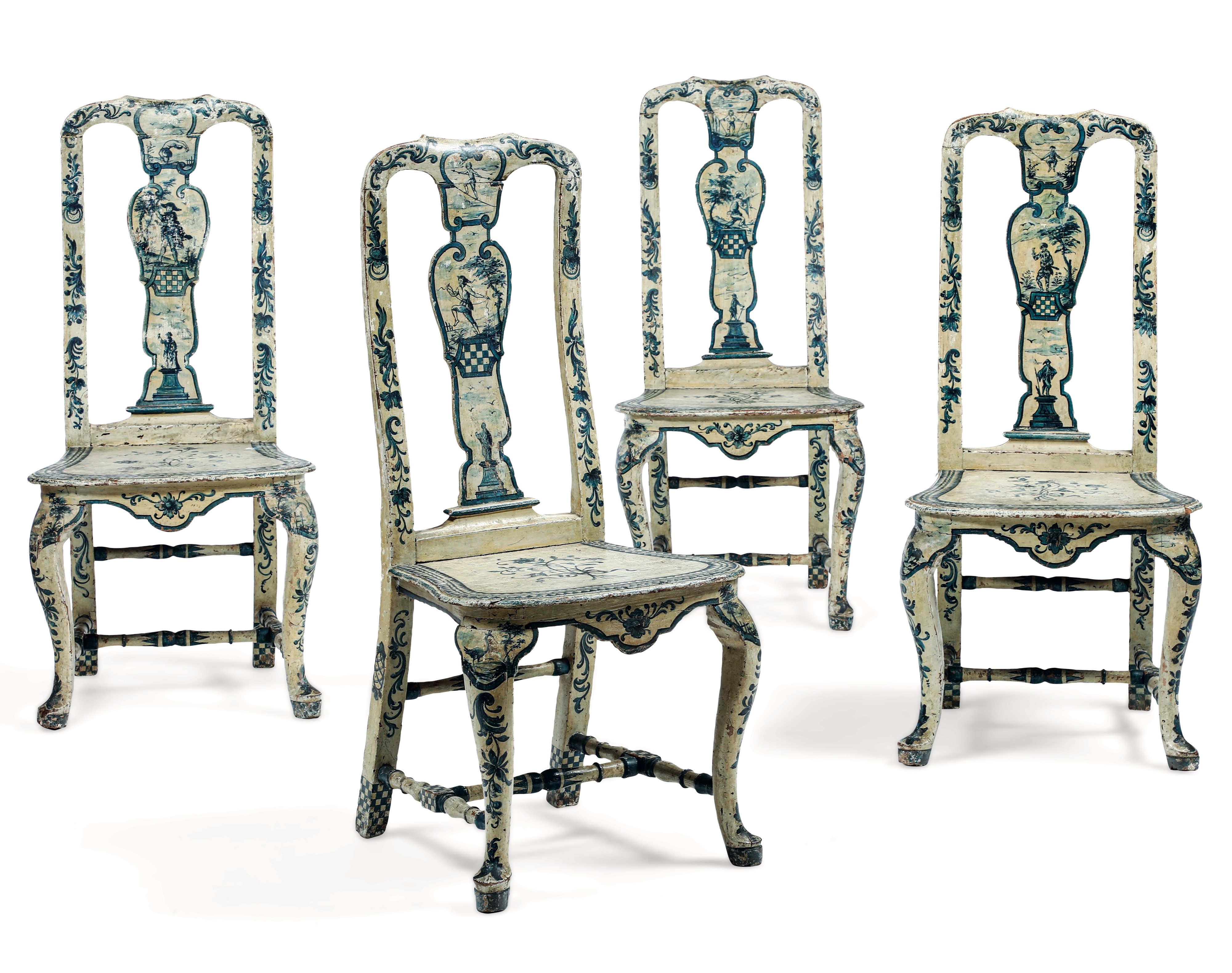 Quattro sedie Luigi XV in legno laccato. Probabilmente Piemonte, XVIII secolo
