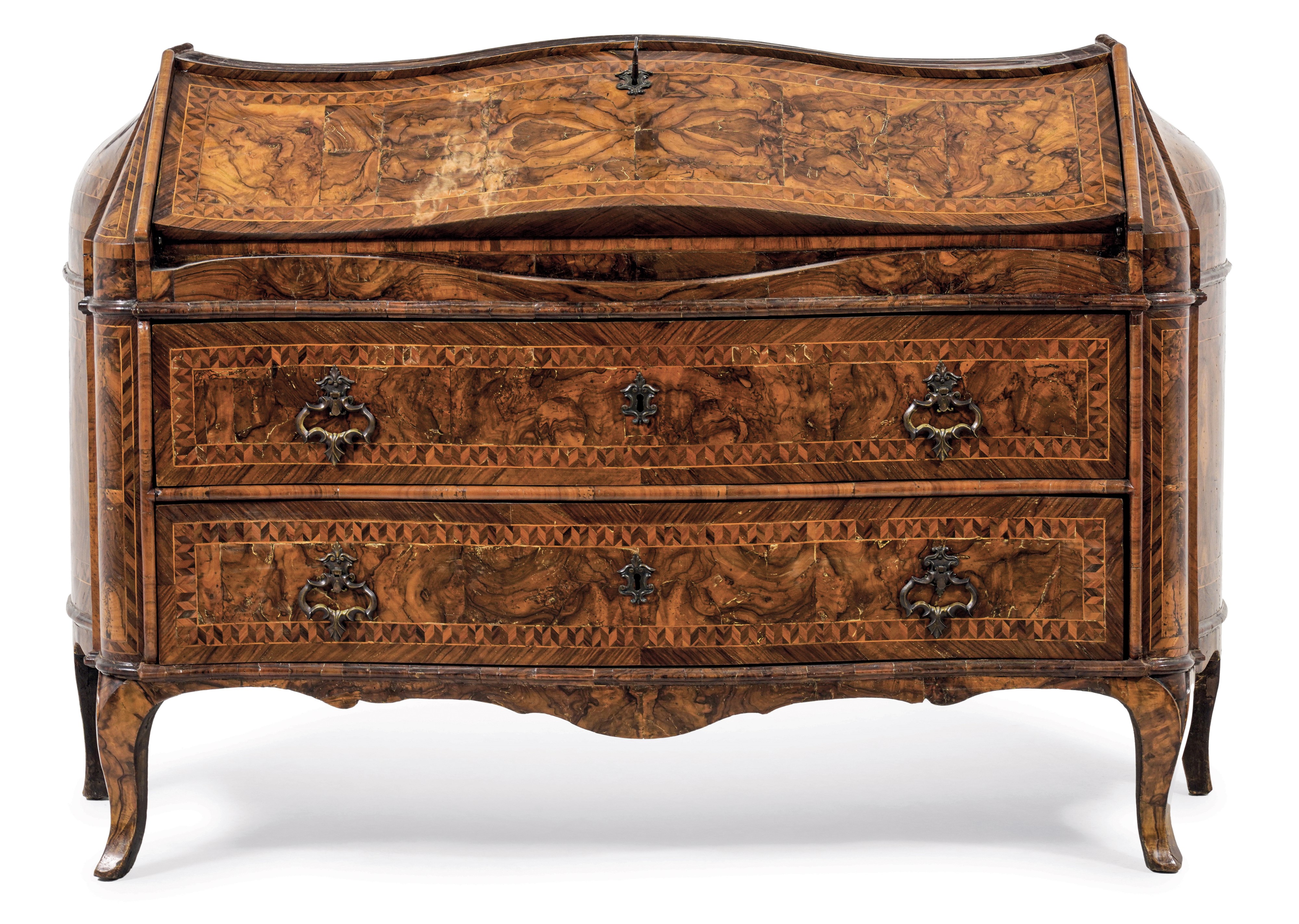 lastronato in noce e radica di noce, filettato e intarsiato a motivo geometrico susseguente che incornicia riserve in radica. Doppia mossa sul fronte, sui fianchi, sulla calatoia e sul piano. Fronte a due cassetti e calatoia celante vano e quattro tiretti disposti su due colonne scorrevoli che svelano due segreti; grembiale sagomato e piedi arcuati. Maniglie e bocchette in bronzo