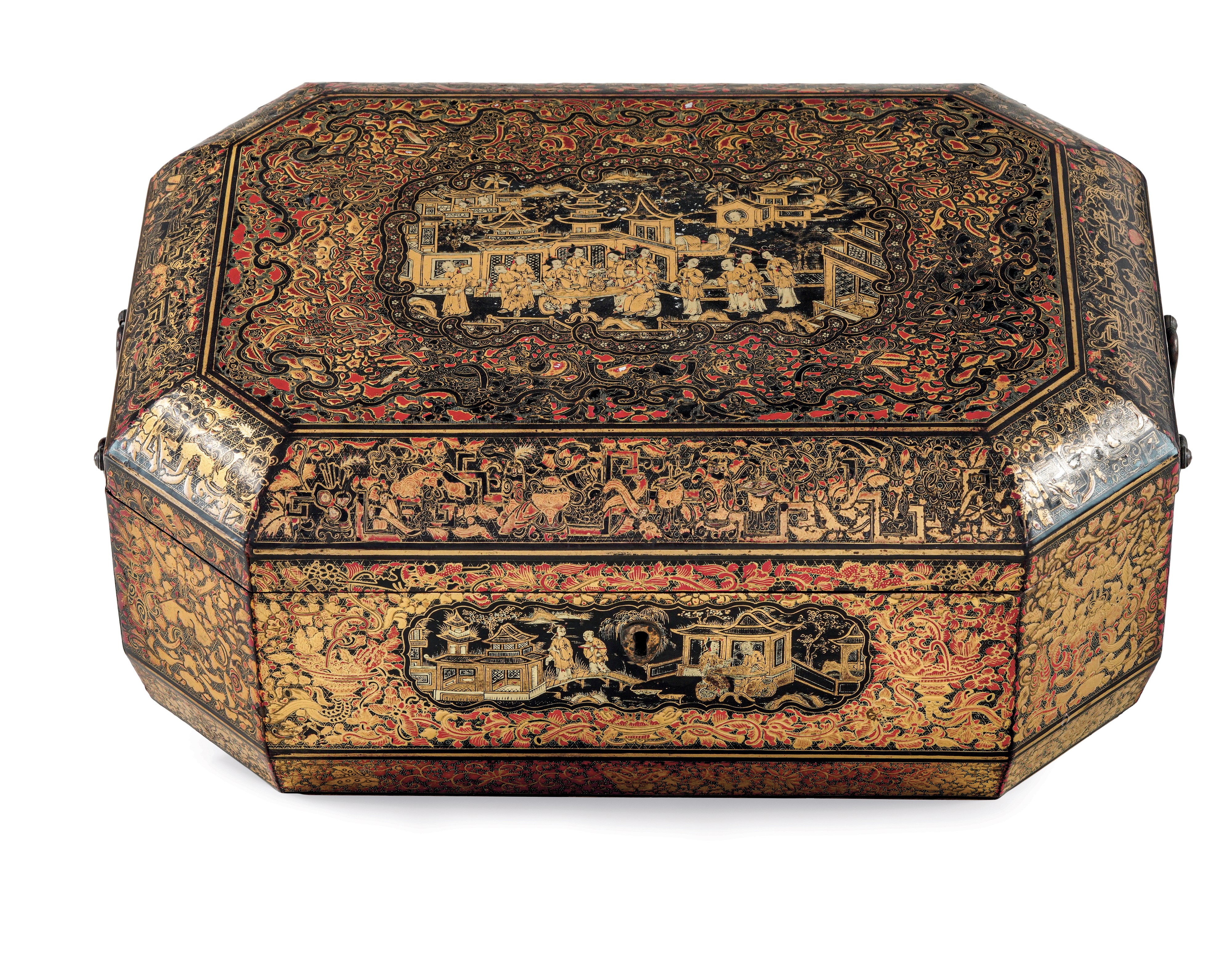 Scatola in legno laccato raffigurante scena di vita comune e decori naturalistici sui toni dell'oro e rosso, Cina, inizio XIX secolo
