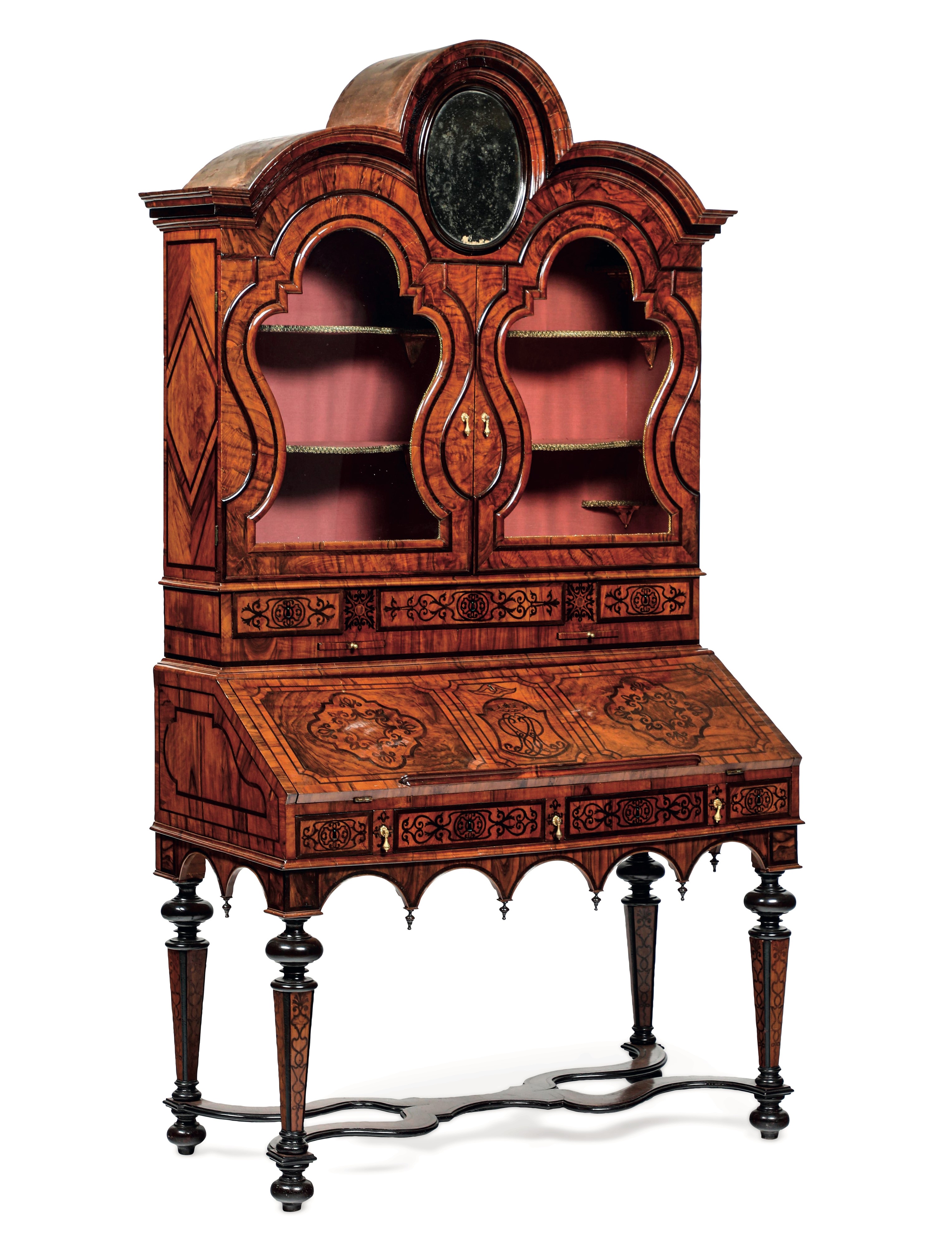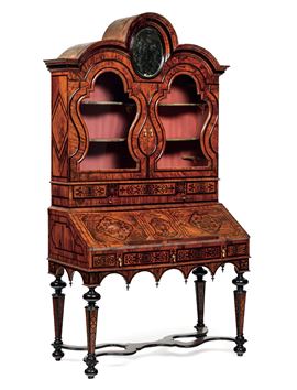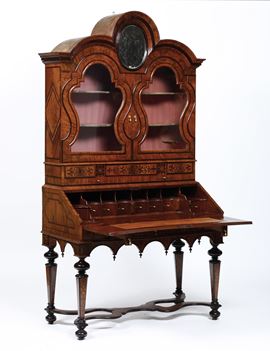 decoro a motivi vegetali stilizzati, profili ebanizzati. Alzata con pianetti estraibili, cassettini e due ante a vetri sagomate sormontate da specchio ovale centrale, cappello centinato. Scrittoio con anta ribaltabile, fascia a cassettini, grambiale a coda di rondine, gambe rastremate