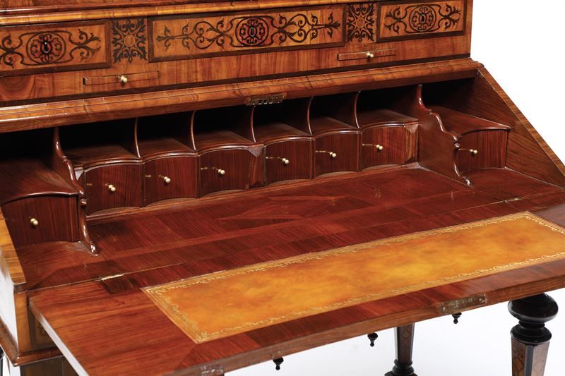 Scrittoio a ribalta con alzata intarsiato e filettato. XVIII-XIX secolo