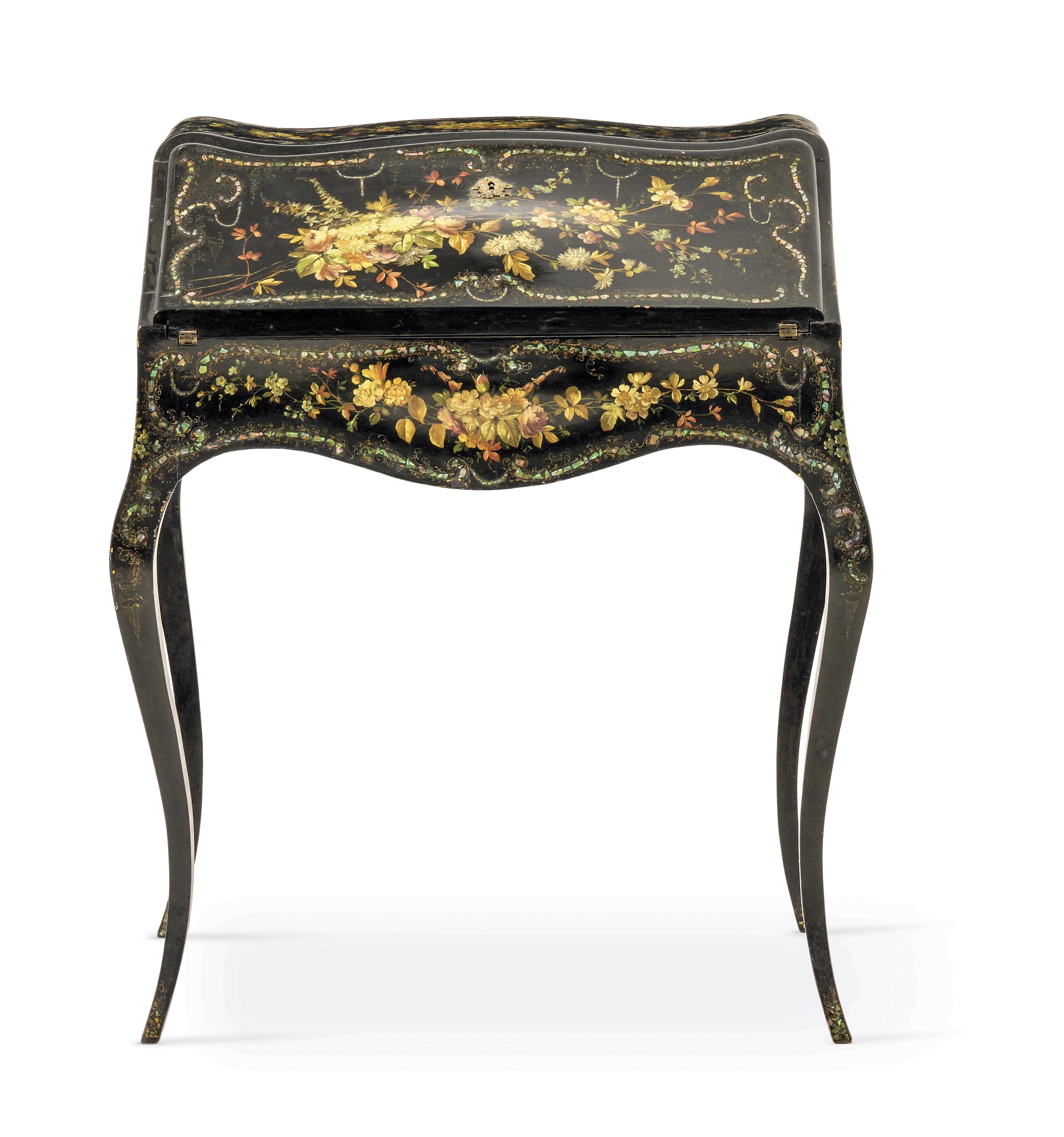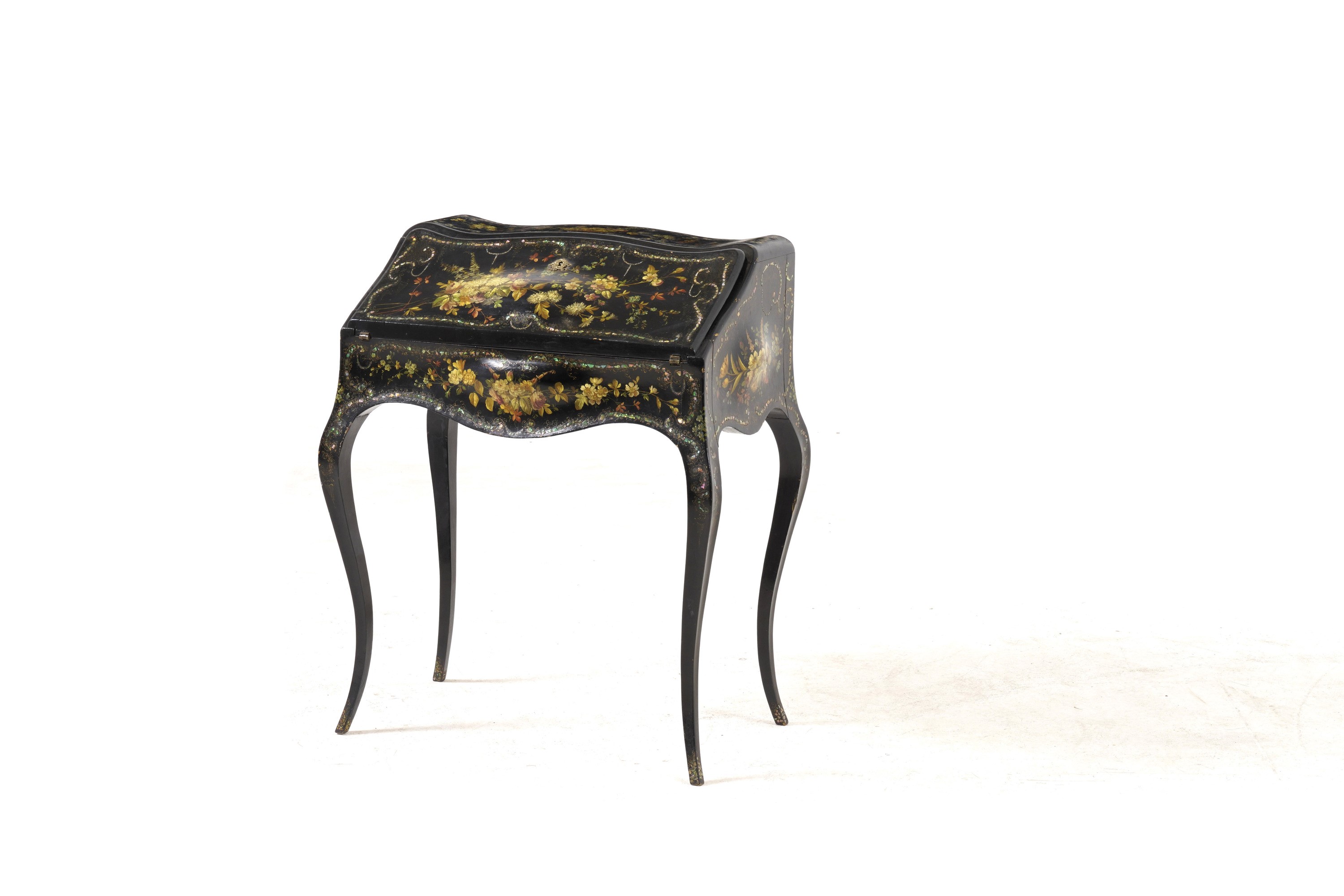 decorazione floreale dipinta in policromia con inserti in madreperla, anta celante cassetti e segreti, alte gambe arcuate