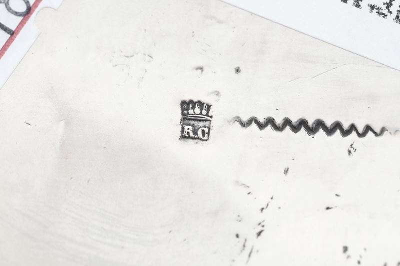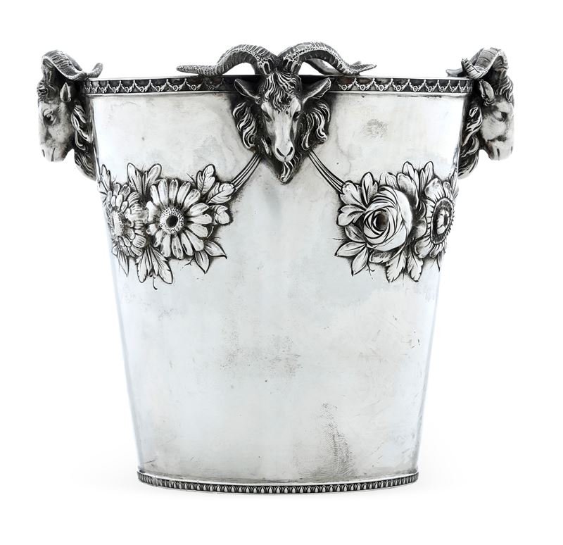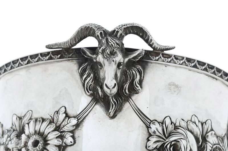 cesellato a teste di ariete e sbalzato a motivi floreali.