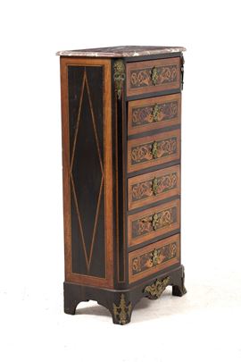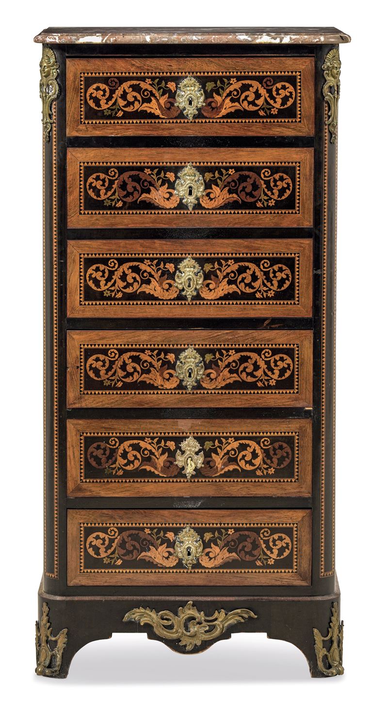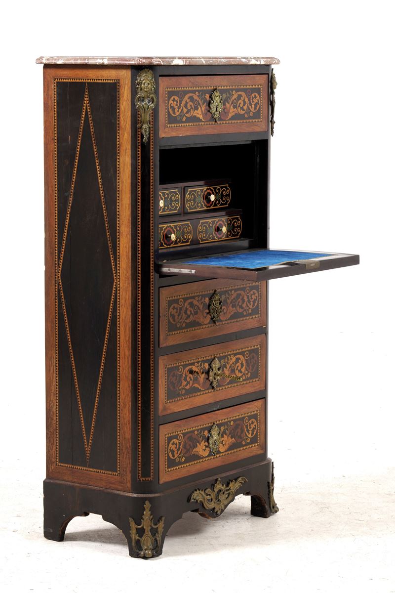 fronte a quattro cassetti e anta ribaltabile decorata a finti cassetti, celante cassettini e vano interno. Decoro di girali vegetali, applicazioni in bronzo dorato, piano in marmo