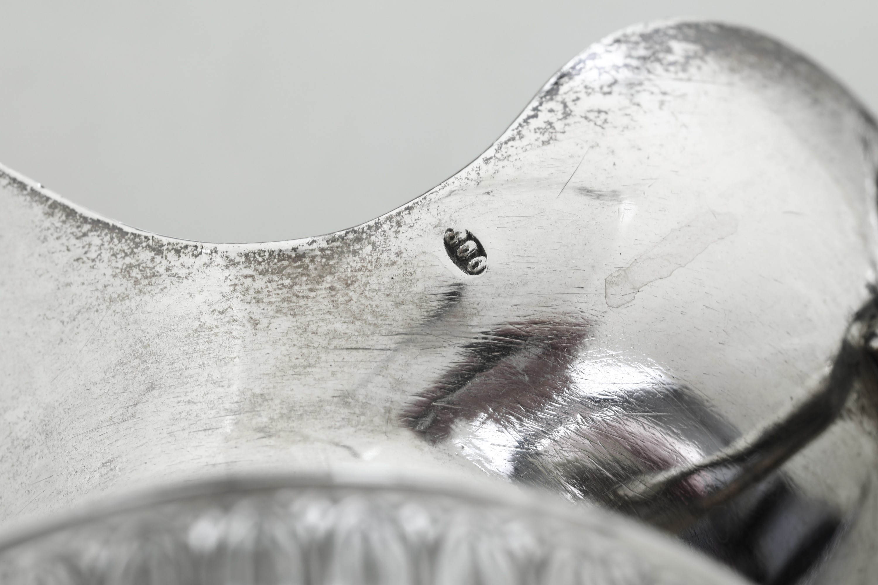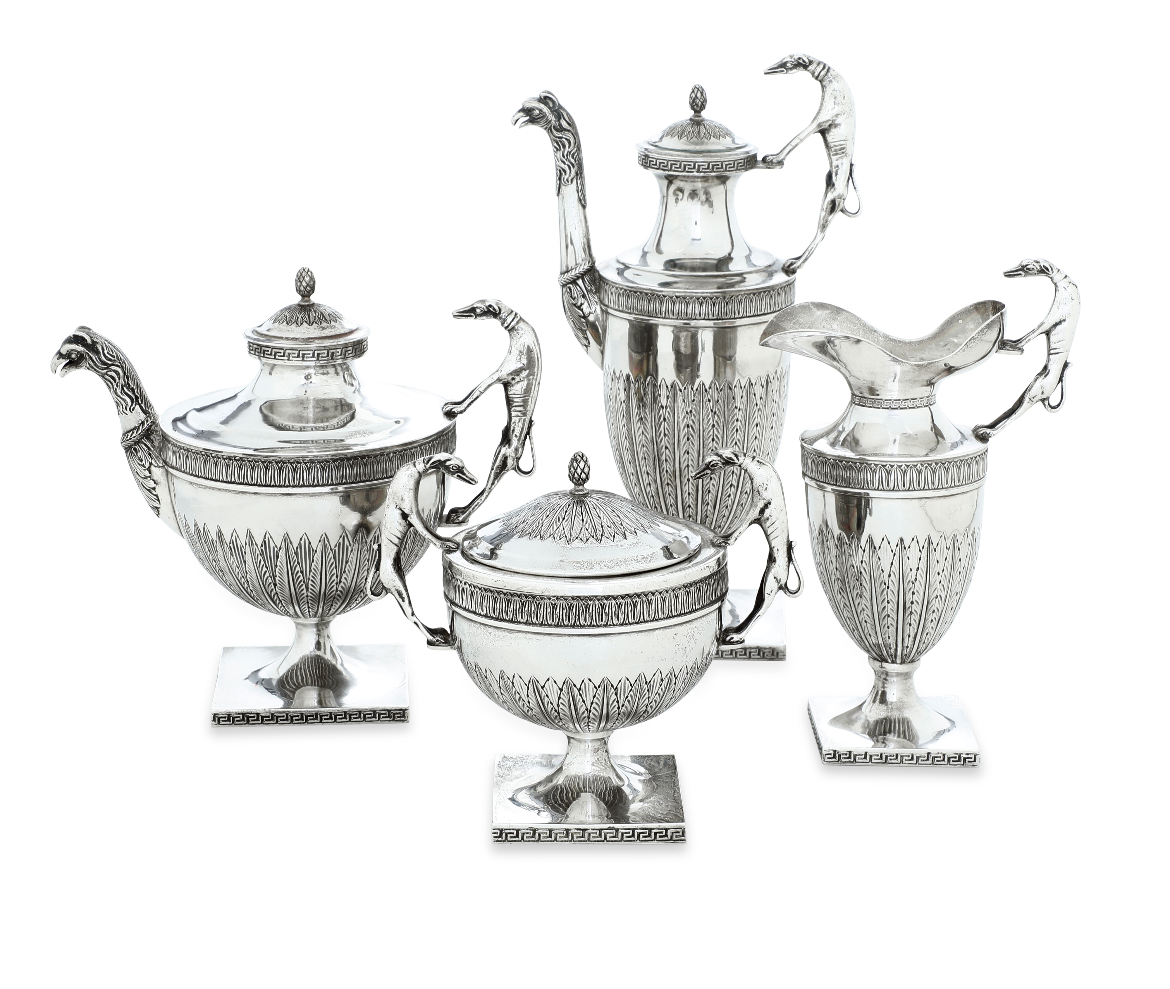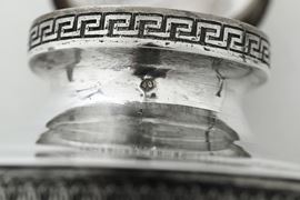 decori a cesello a motivo di foglie lanceolate di gusto neoclassico; prese in forma di levriero; beccuccio cesellato
