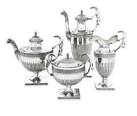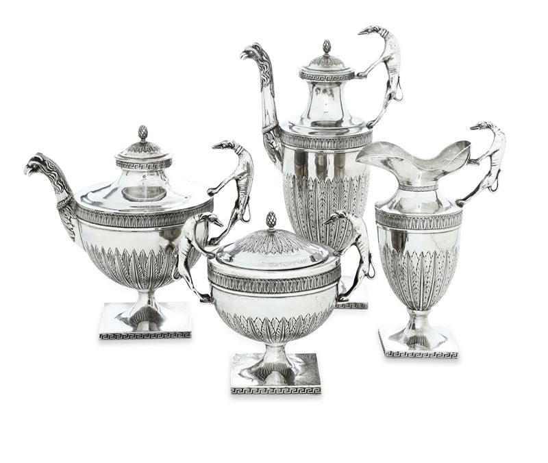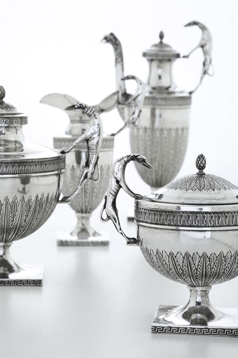 a testa di rapace. Si compone di teiera, caffettiera, lattiera, zuccheriera e vassoio ovale con bordo a ringhierina.