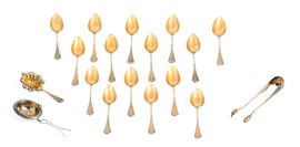 composto da 18 cucchiaini da tè, 1 paletta da dolce (senza manico), 1 colino per teiera, un cucchiaino da zucchero e 1 pinza per zollette. In custodia originale