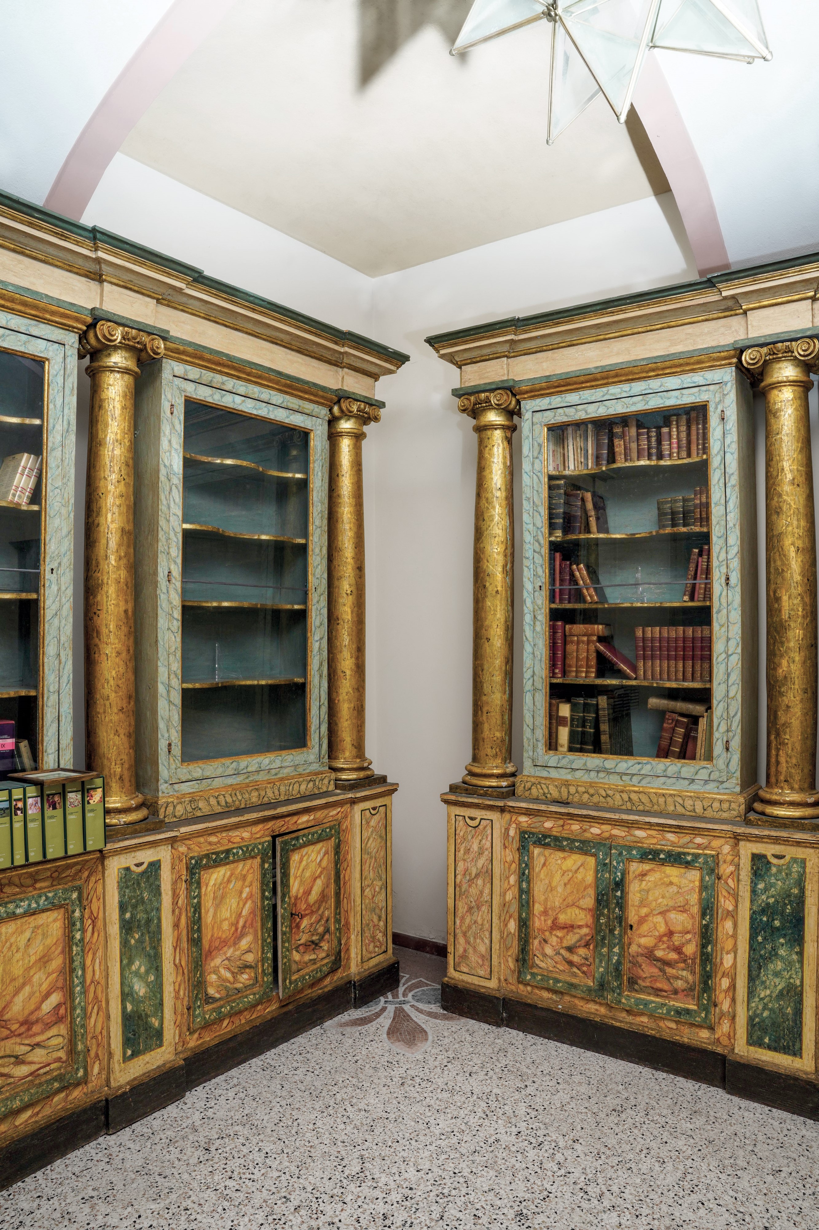 legno dorato e laccato a finto marmo, montanti scolpiti a colonna ionica, parte superiore a vetri, parte inferiore a sportelli. La coppia di librerie a due ante, la terza ad un’anta.