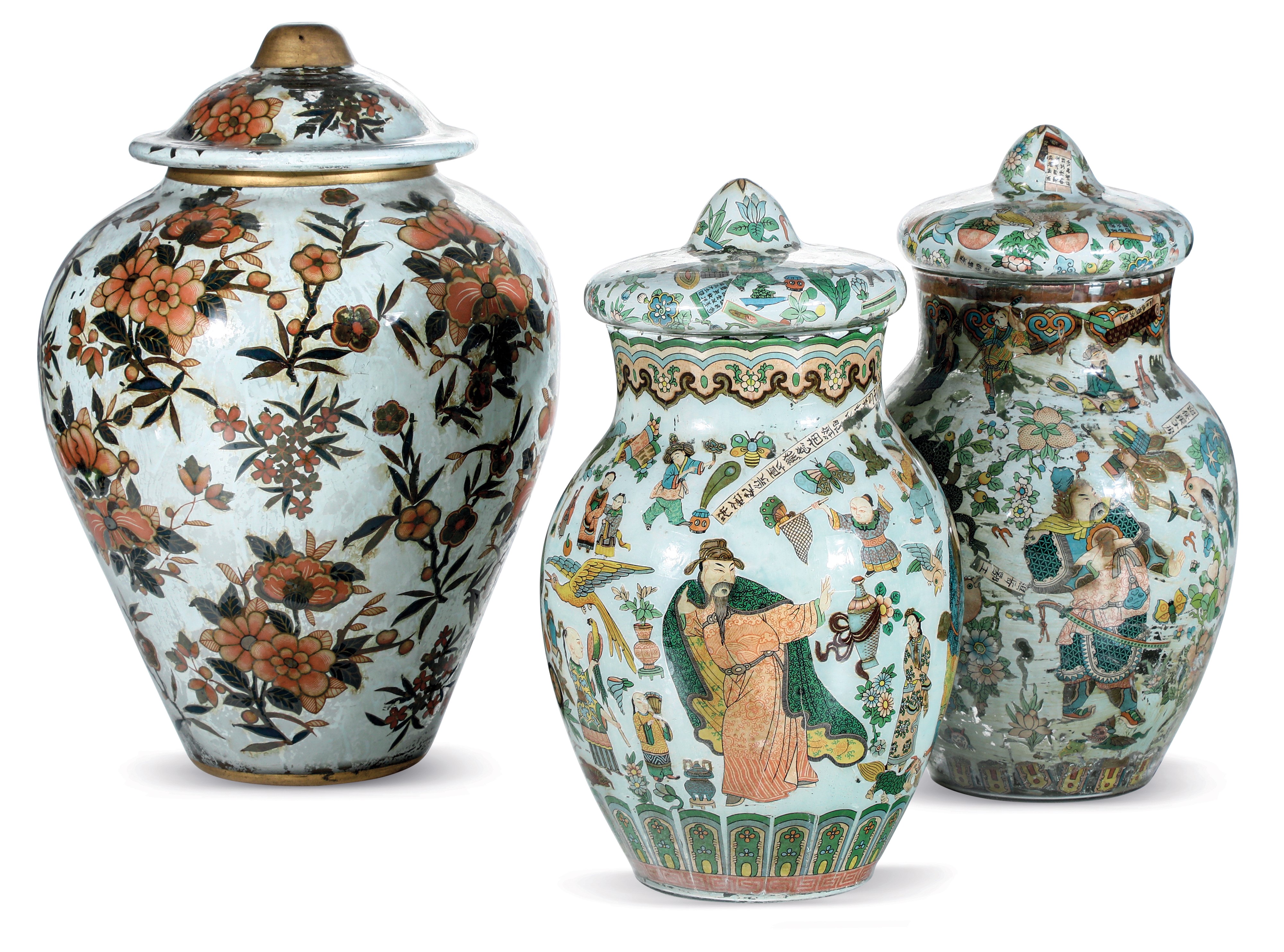 Tre potiches con coperchio in vetro soffiato decorato ad arte povera. Piemonte, XVIII secolo