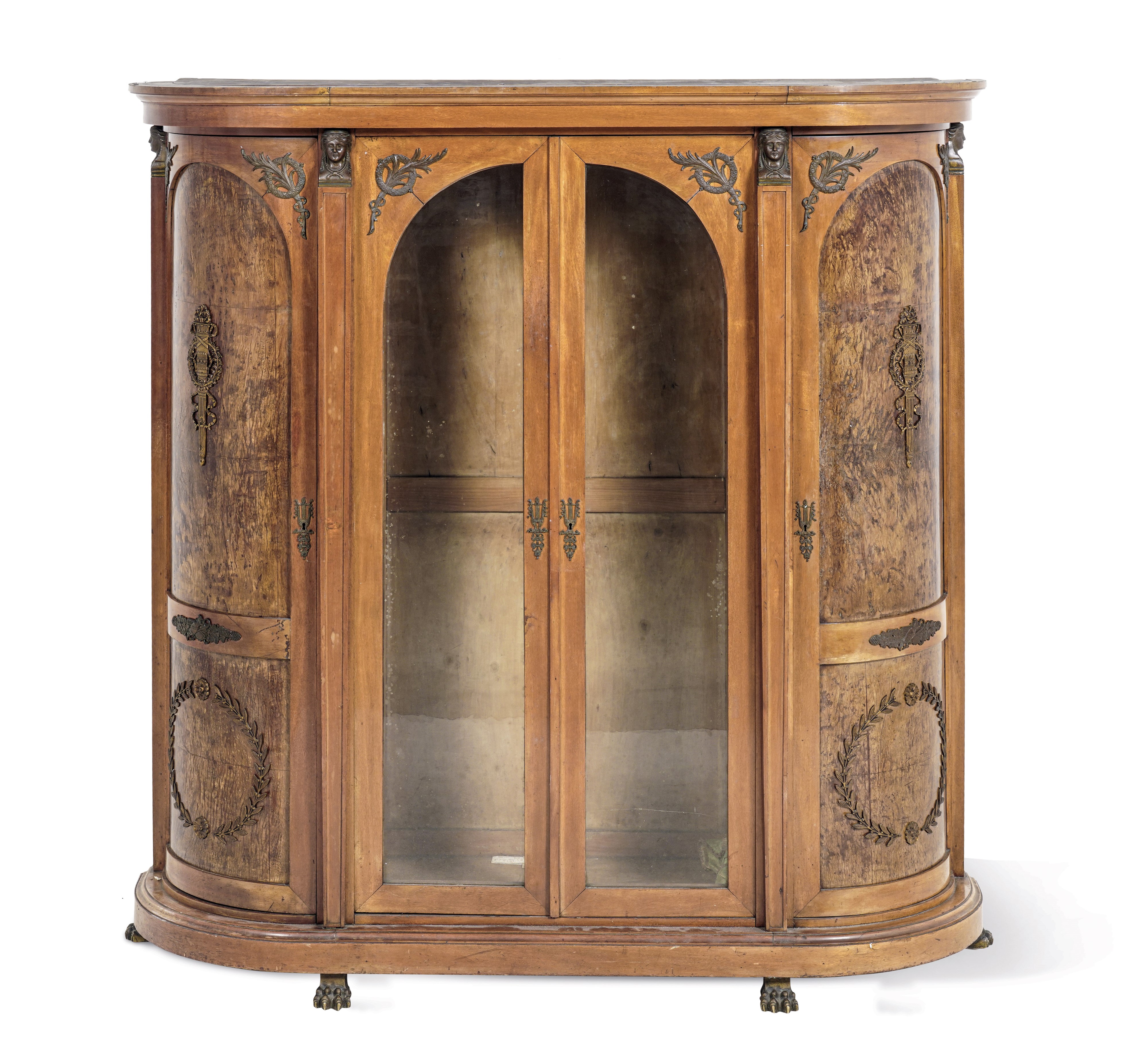 lesene sui montanti sormontate da erme, piedi ferini, applicazioni di fregi in metallo a foggia di torce e corone d'alloro, sportelli laterali