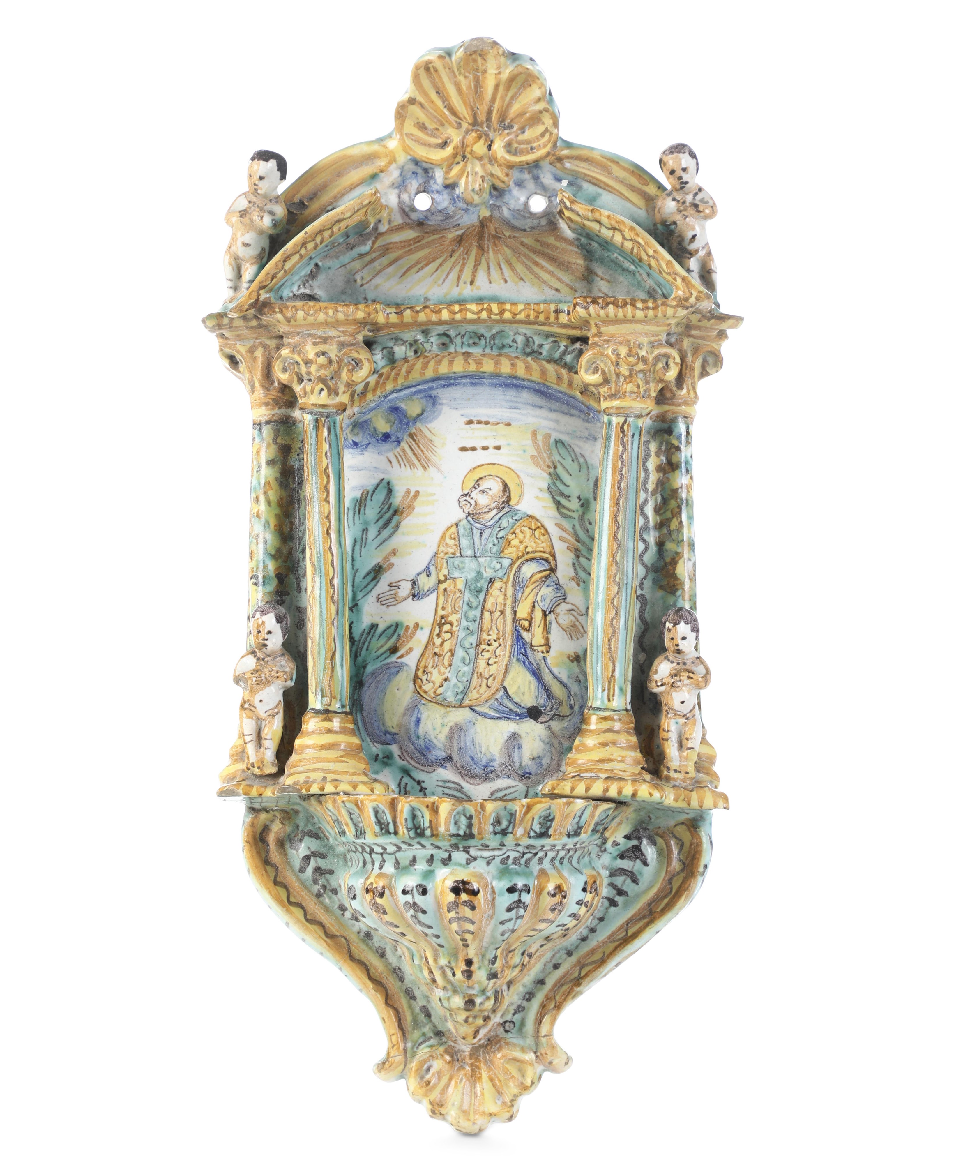 Maiolica. Altezza cm 44. Conservazione: ottima; conchiglia inferiore incollata; sbeccature minori