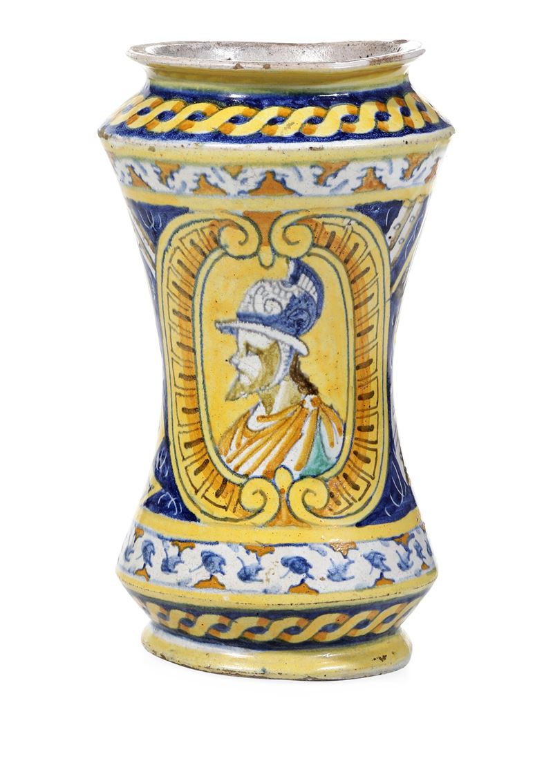 Albarello dalla forma allungata e rastremata al centro, con spalla e calice angolati, decorato a trofei dove una cartella porta la sigla “SPQP” - per “Senatus PopulusQue Panormitanus” e la data 1612. Un guerriero barbuto con elmo, entro un medaglione dalla cornice baccellata, occupa la parte frontale. In alto e in basso corrono due fasce, una con cordone intrecciato e l’altra a motivi fogliati