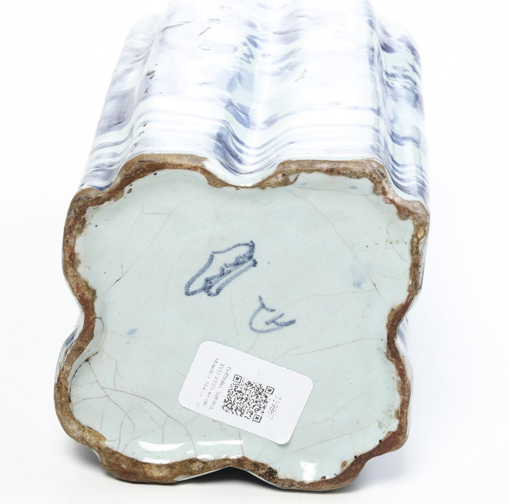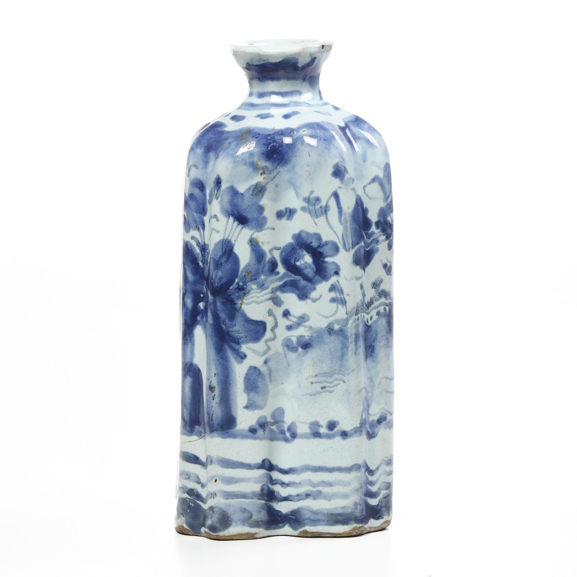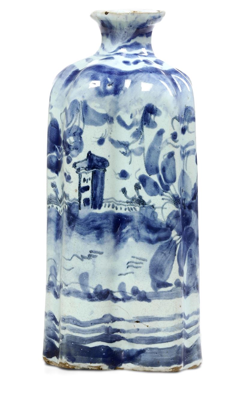 La bottiglia, dal corpo a sezione quadrangolare costolato rivestito di smalto stannifero leggermente azzurrato, è decorata in monocromia blu di cobalto col motivo savonese “a tapezzeria” con un edificio turrito, altri in lontananza e cespi fioriti