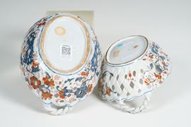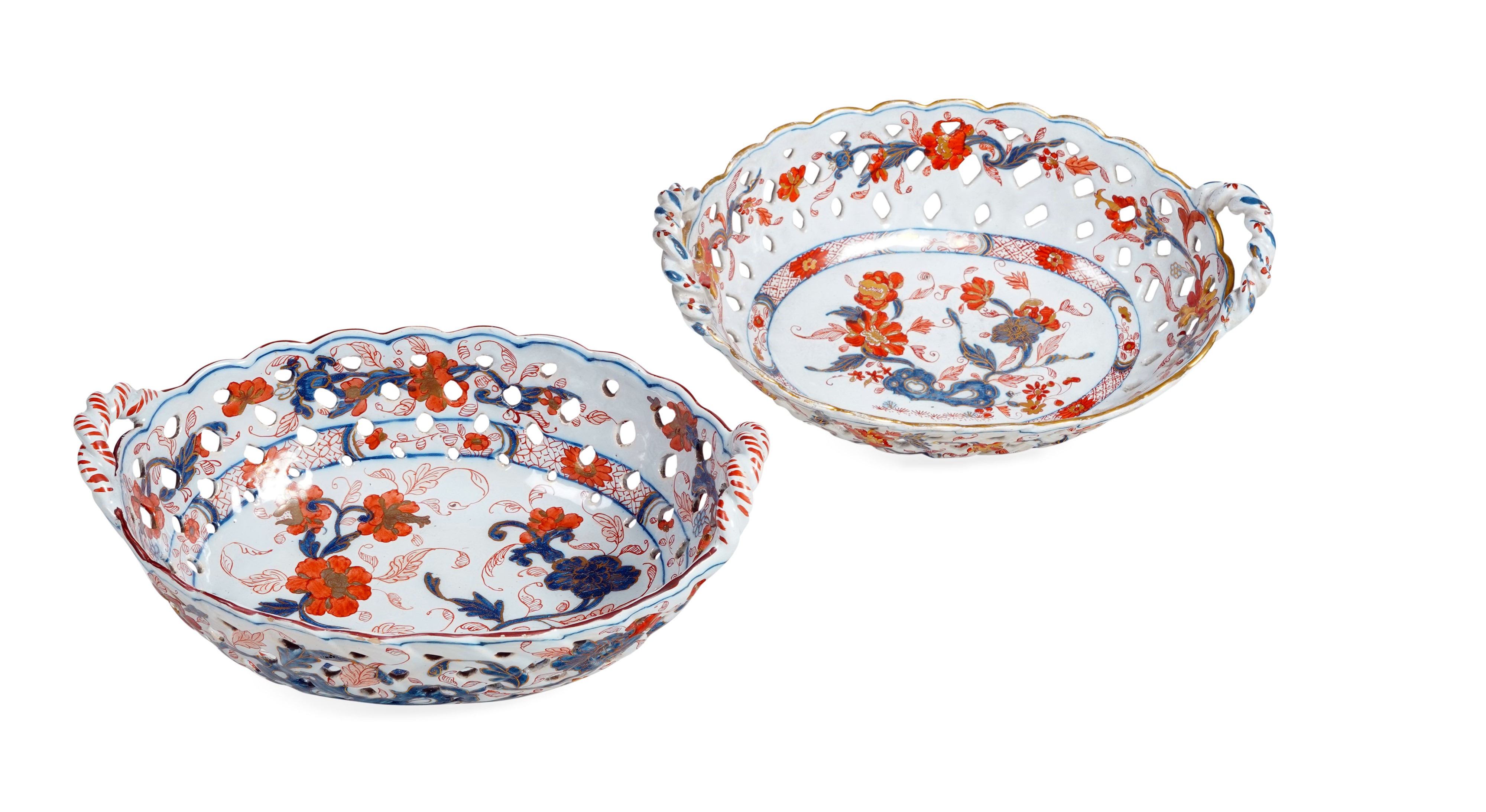 I cestini, dal bordo traforato e manici a tortiglione, sono decorati con motivo d’ispirazione Imari in blu, rosso e oro su fondo leggermente azzurrato con tralci che presentano peonie al centro e fiori secondari con qualche foglia su rami blu