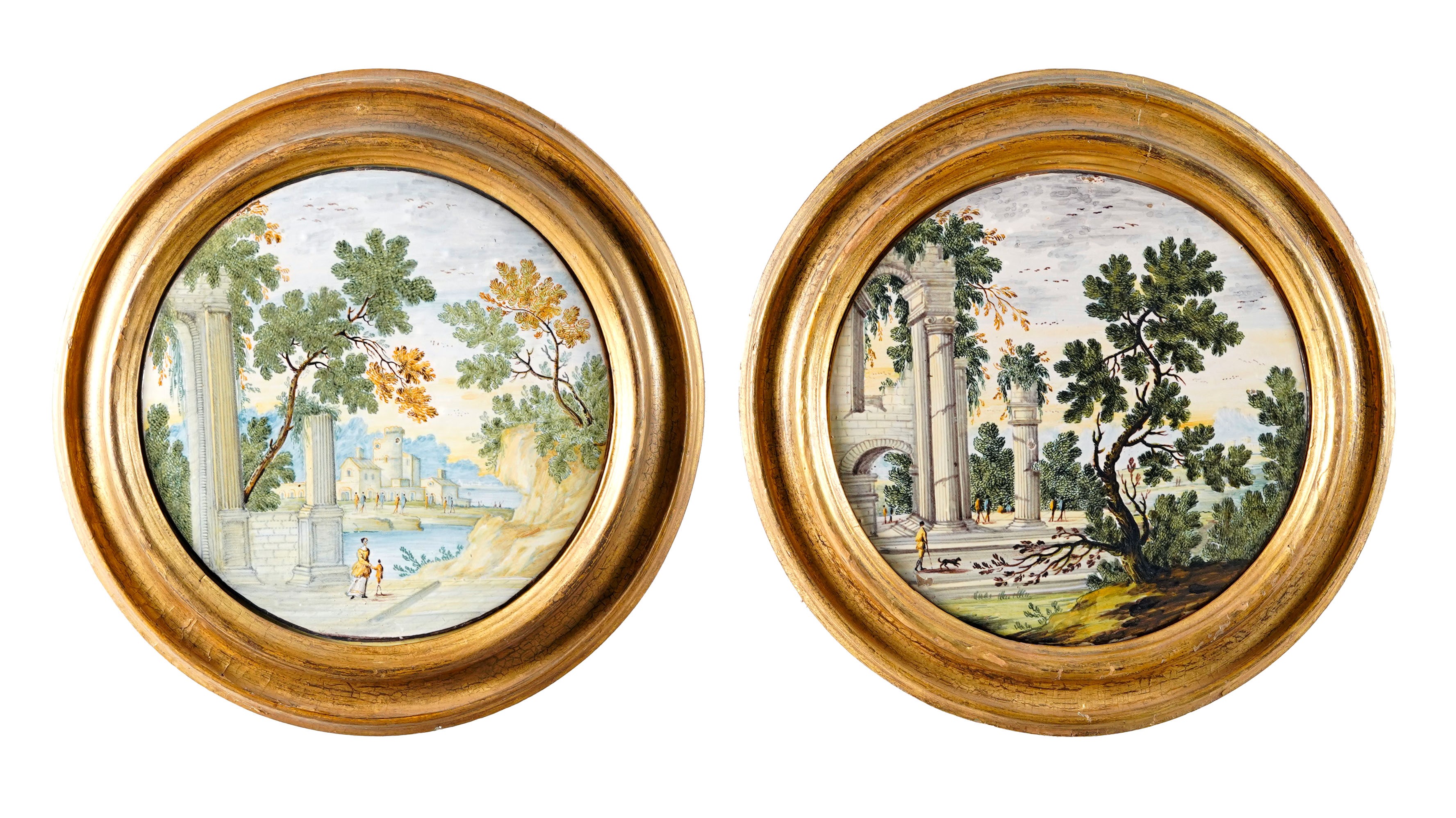 Le targhe sono decorate in policromia “a paese”, tipologia assegnata solitamente a Nicola Cappelletti (1691-1767). Un paesaggio animato da piccoli viandanti, ospita in primo piano rovine architettoniche con vegetazione, numerosi piccoli uccelli volano in stormo nell’ampio cielo
