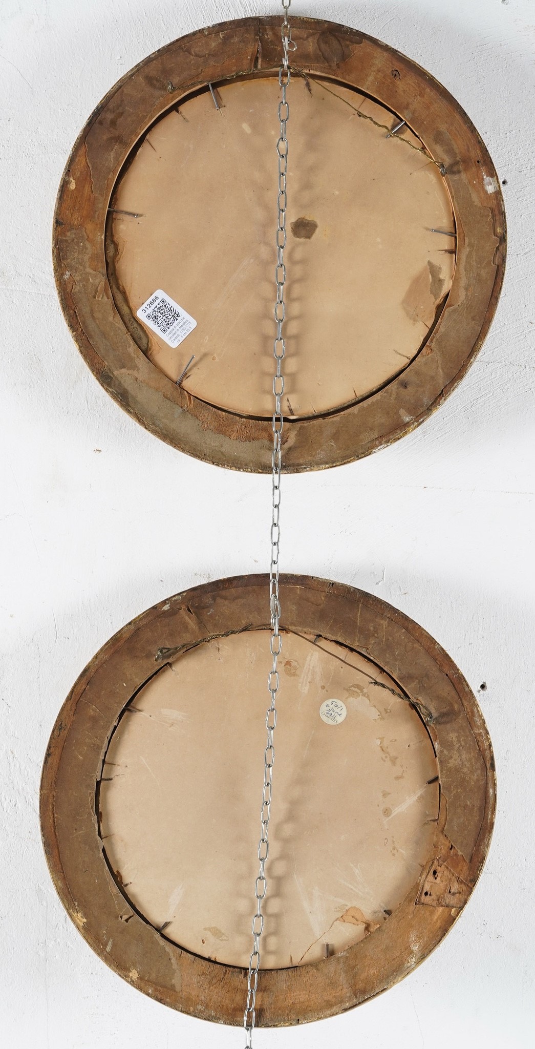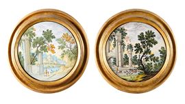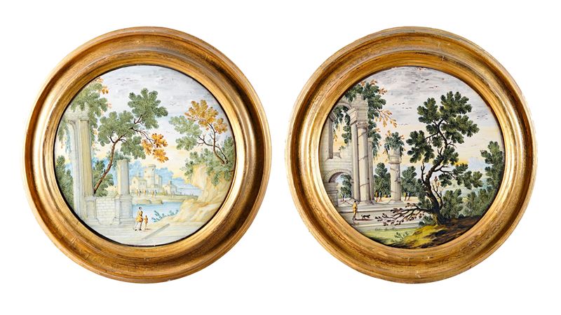 Maiolica. Diametro cm 23,8. Conservazione: ottima. Cornici moderne in legno (diametro cm 32,5 circa)