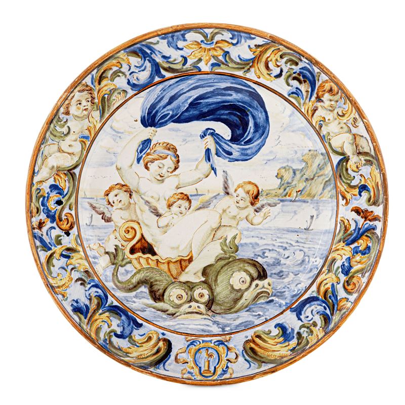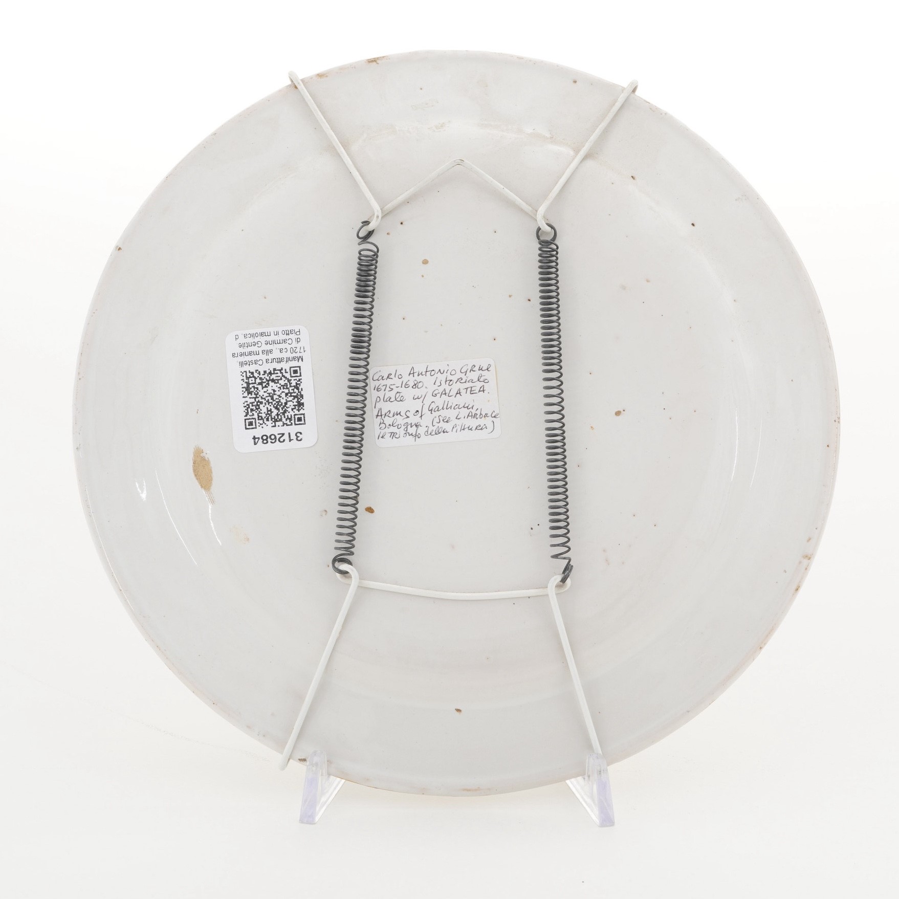 Il piatto, dalla tesa decorata ad ampi girali fogliati, tra i quali appaiono due putti in posizione animata, è istoriato nel cavetto con “Il trionfo di Galatea” scena ispirata all’affresco di Annibale Carracci di Palazzo Farnese a Roma. La tesa è influenzata da quelle dipinte da Carlo Antonio Grue che ci portano a datare quest’opera agli inizi del Settecento. In basso sulla tesa troviamo un blasone bolognese probabilmente della famiglia Galliani oppure Galanti, Gallisano o Gallerati