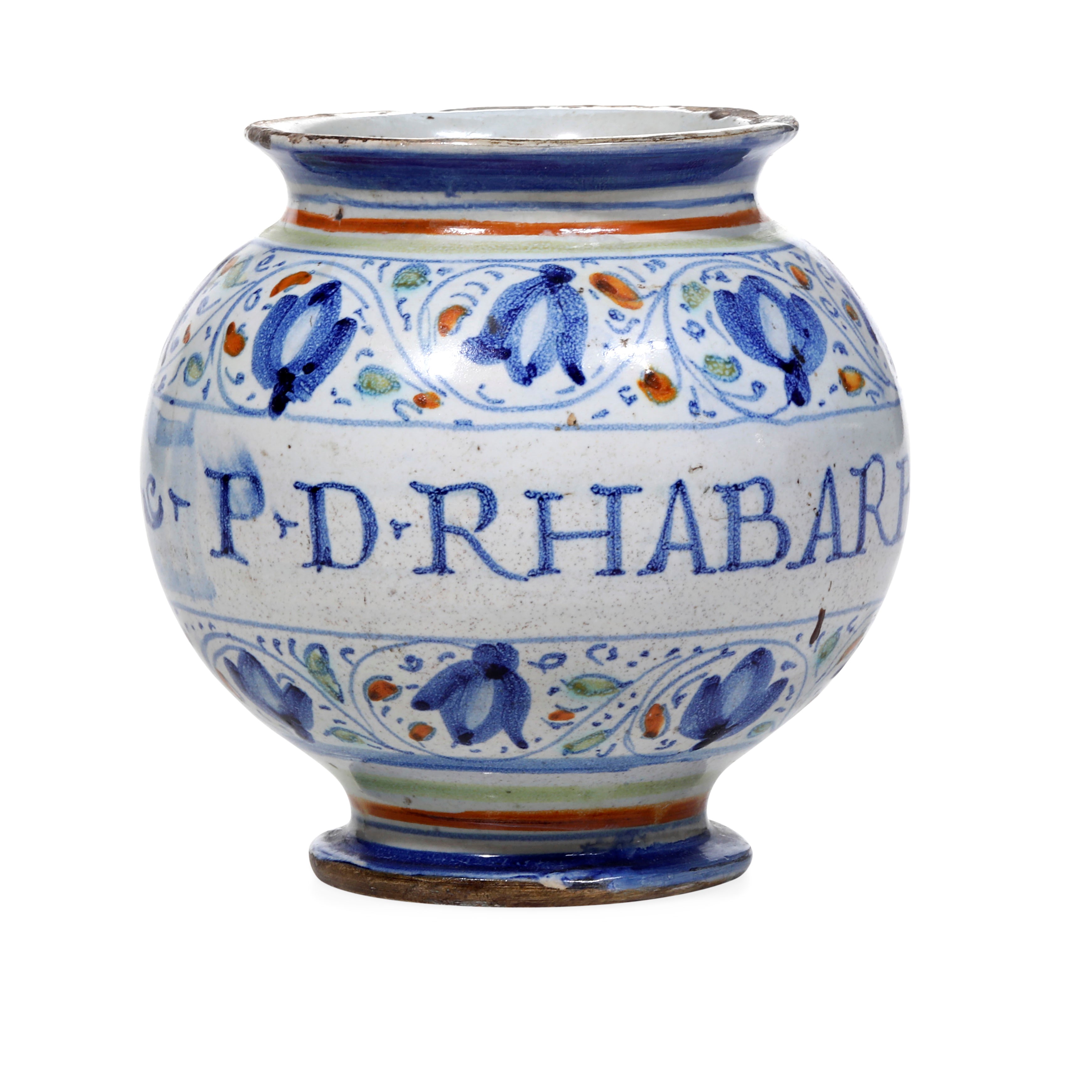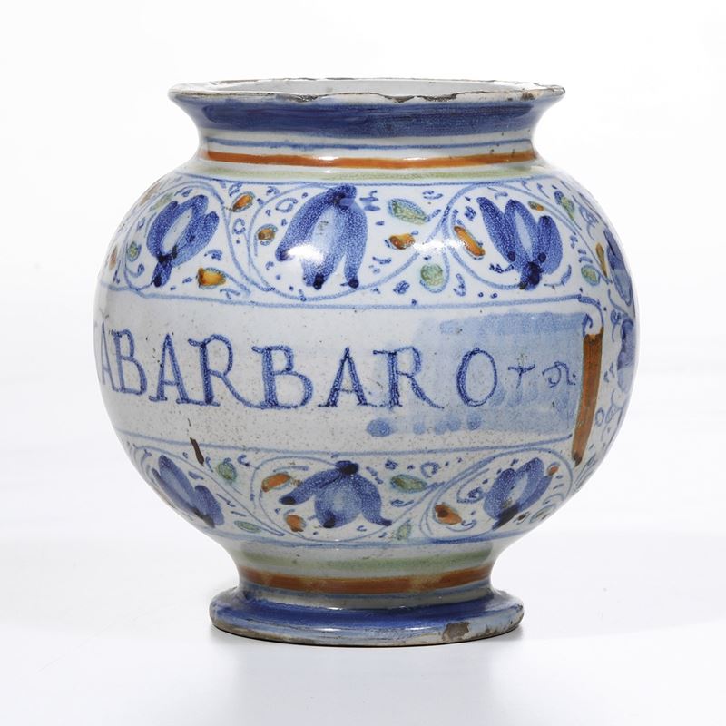 Il pilloliere, dalla forma sferoidale su alto piede e ampia bocca estroflessa, ospita sul fondo berettino, nella zona mediana un’alta fascia con la scritta apotecaria in caratteri capitali “ P.D.RABARBARO”, al di disopra e al disotto corre uno stelo sinuoso con corolle di fiori. Sul verso motivo con foglia accartocciata