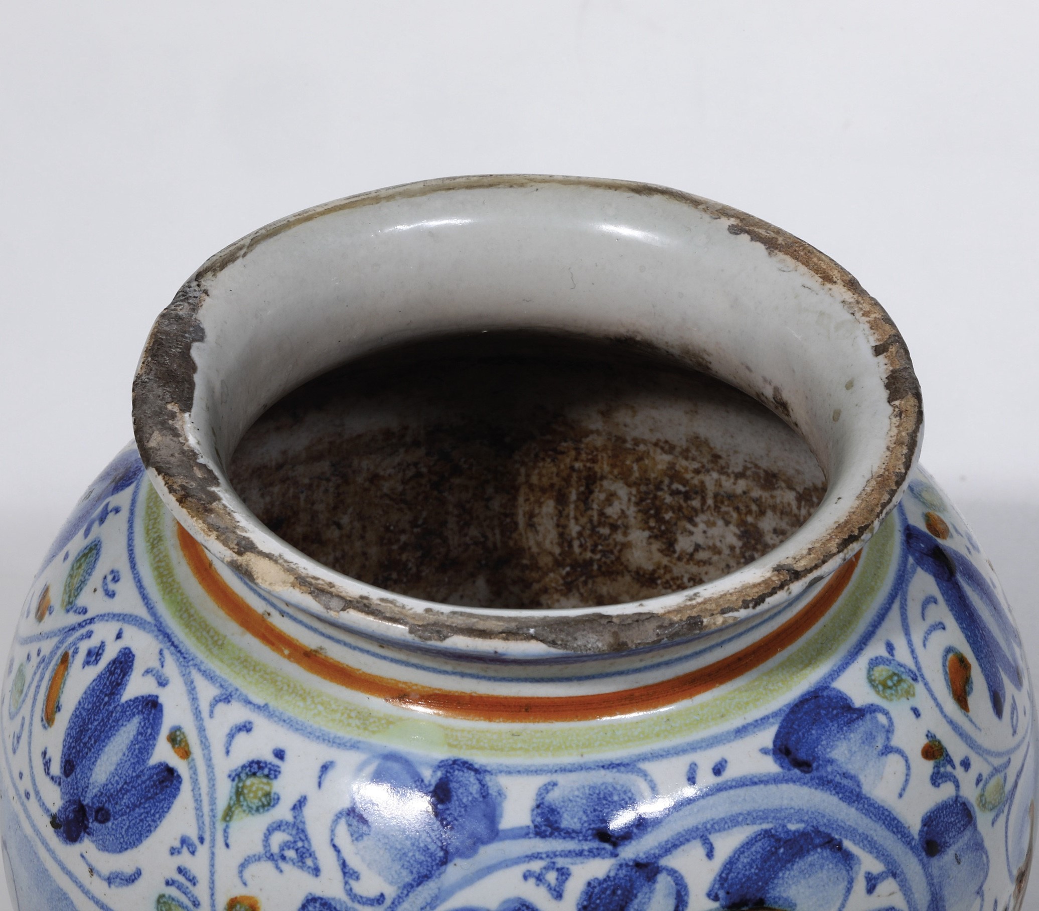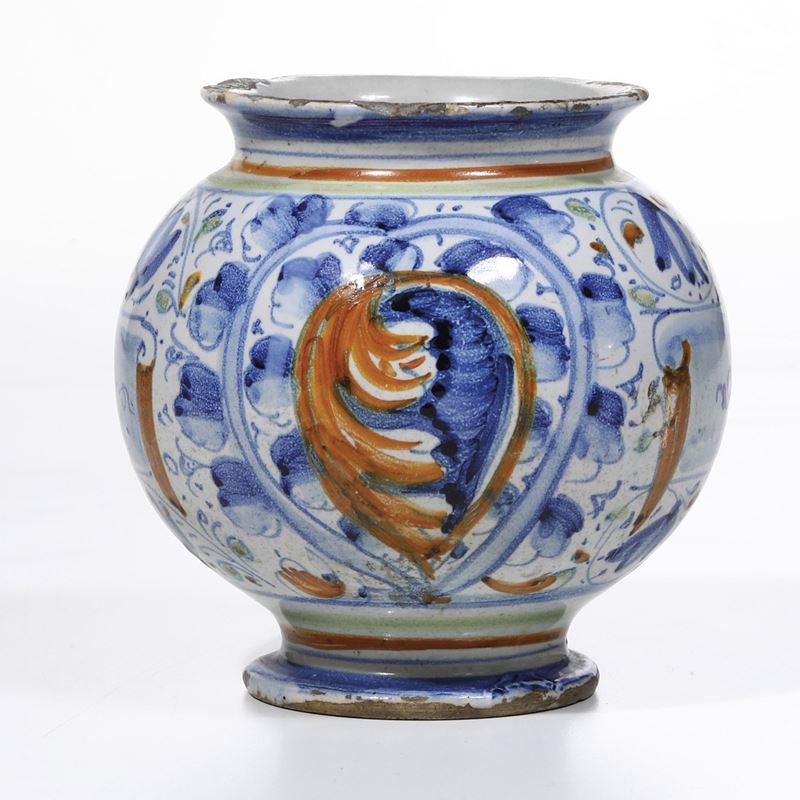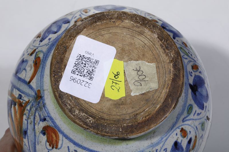 Maiolica. Altezza cm 13,7. Conservazione: buona; restauri al bordo superiore e inferiore