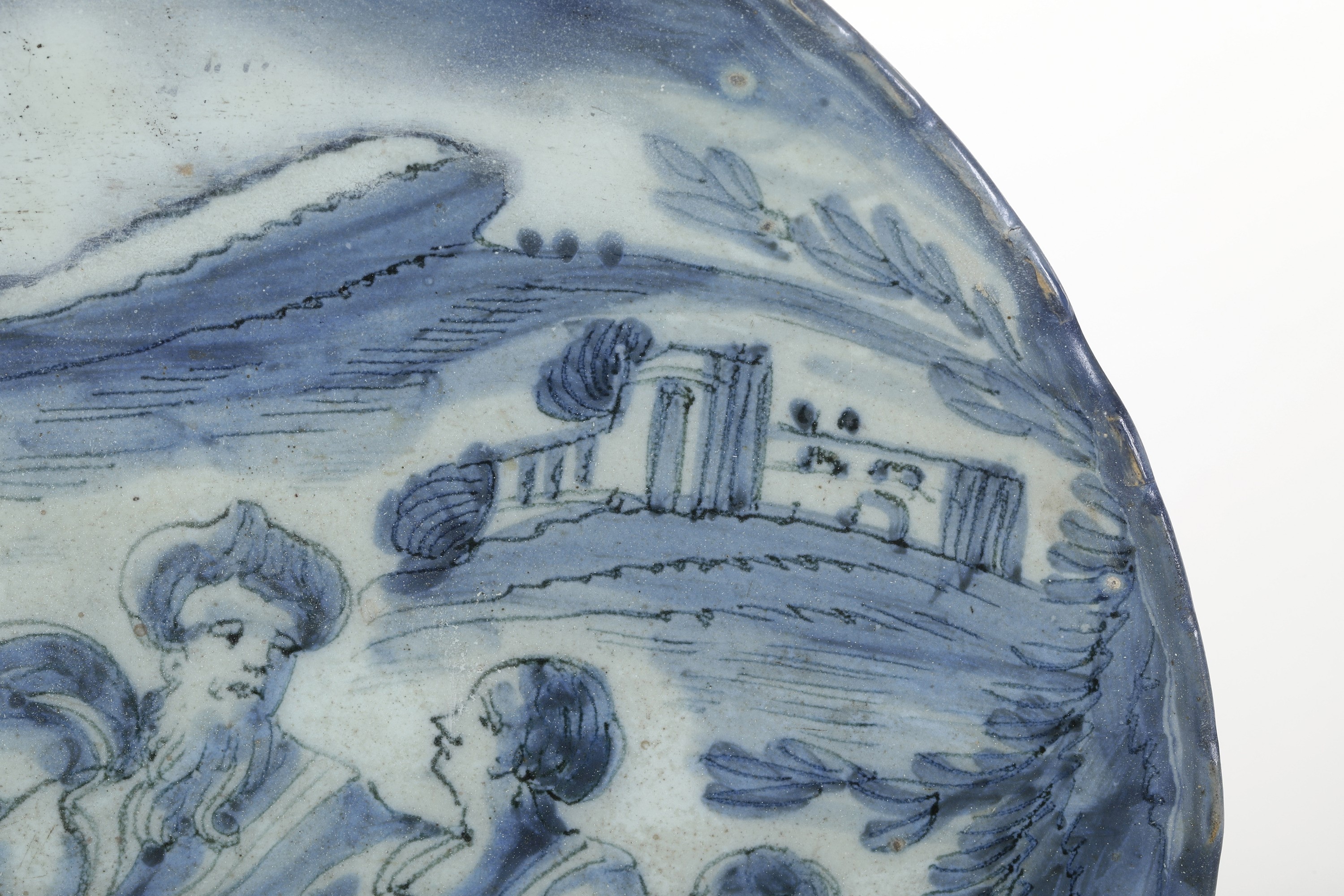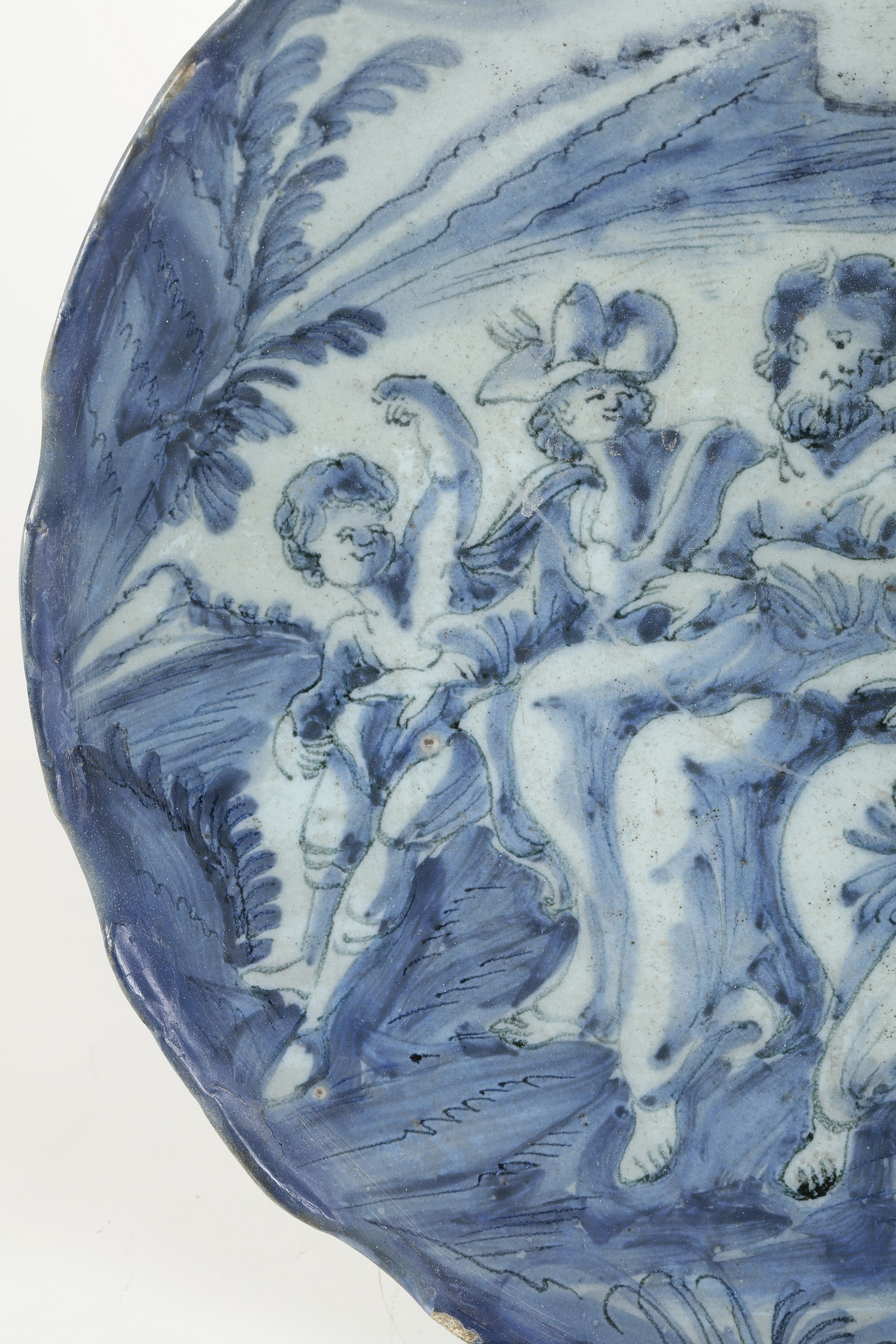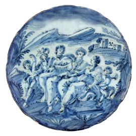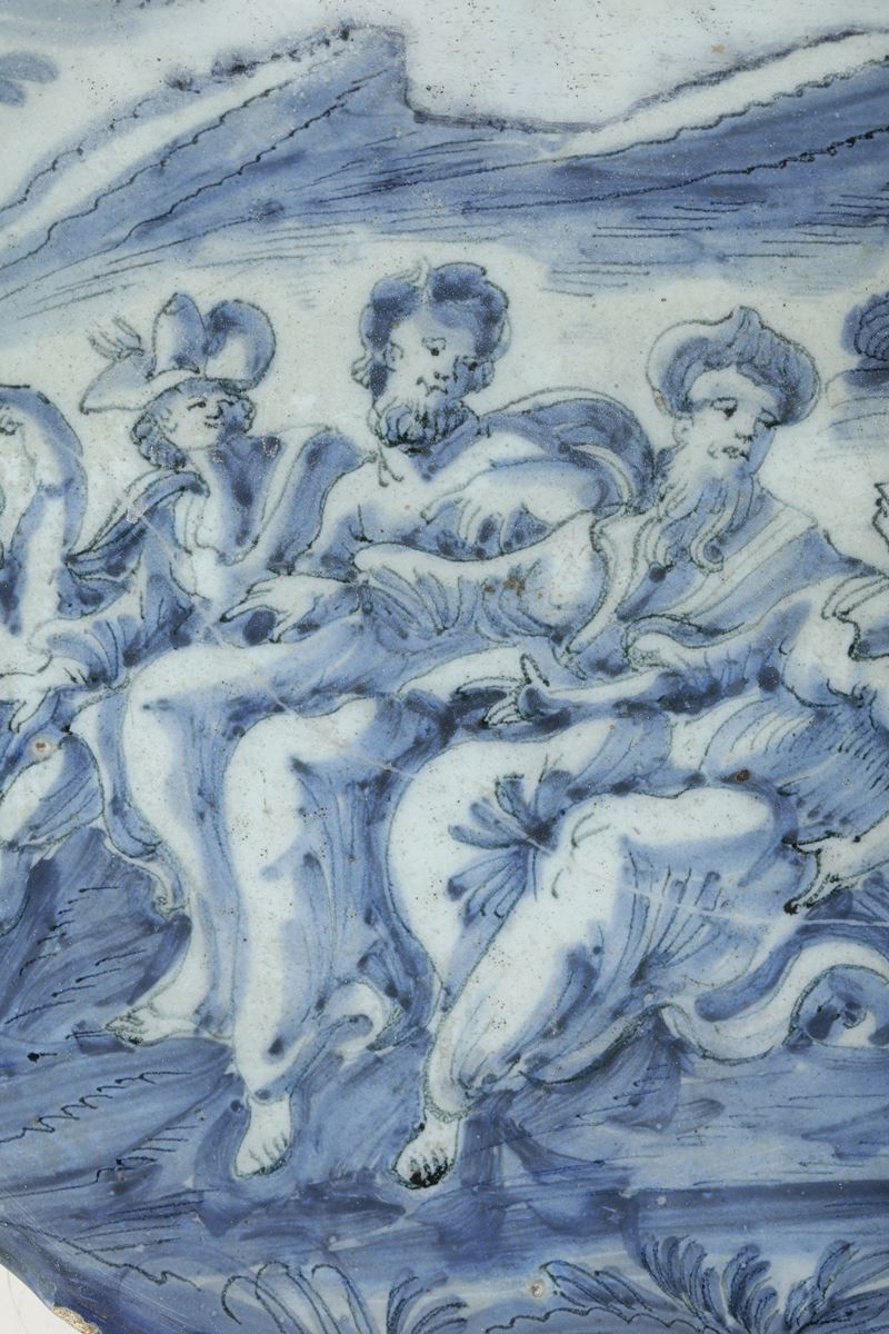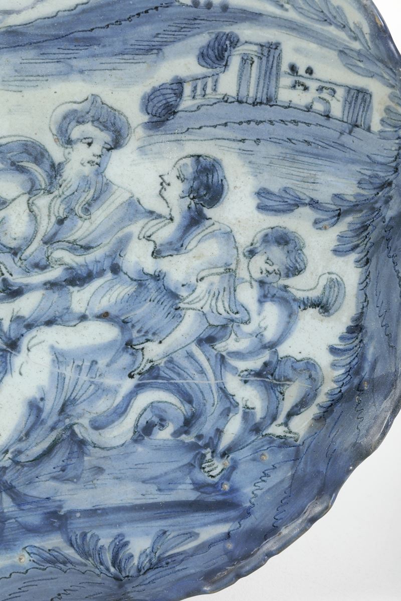 Maiolica. Marca: Corona e lettere “B.C.”. Dimensioni: altezza cm 5,5; diametro cm 30,5. Conservazione: una rottura restaurata tra le ore 11 e le 13; piccoli restauri al bordo e sbeccature
