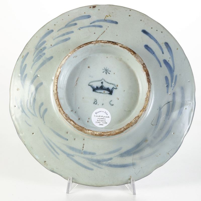 L’asterisco o stella, la corona, le lettere B C, tracciati in colore blu al centro della superficie, quindi nella zona circolare creata dalla presenza della parte superiore del piede, assegnano la maiolica alla fabbrica albisolese di Bernardo Conrado, nell’ultimo quarto del XVII secolo