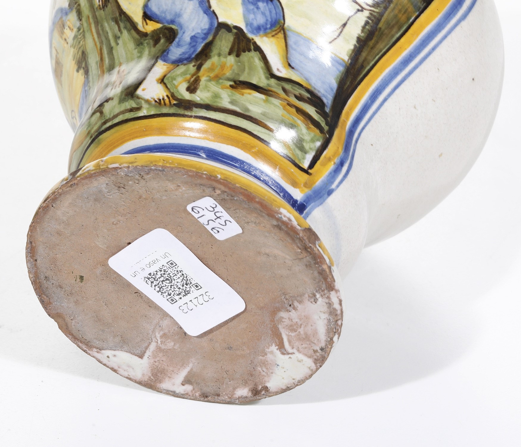 Il vaso a potiche è decorato sul recto in policromia con un giovane villano appoggiato ad un albero in un ampio paesaggio. La forma e la decorazione ricordano i vasi della farmacia dell’Ospedale degli Incurabili di Napoli realizzati da Lorenzo Salandra come ci testimoniano alcuni pezzi siglati e datati dal nostro ceramista