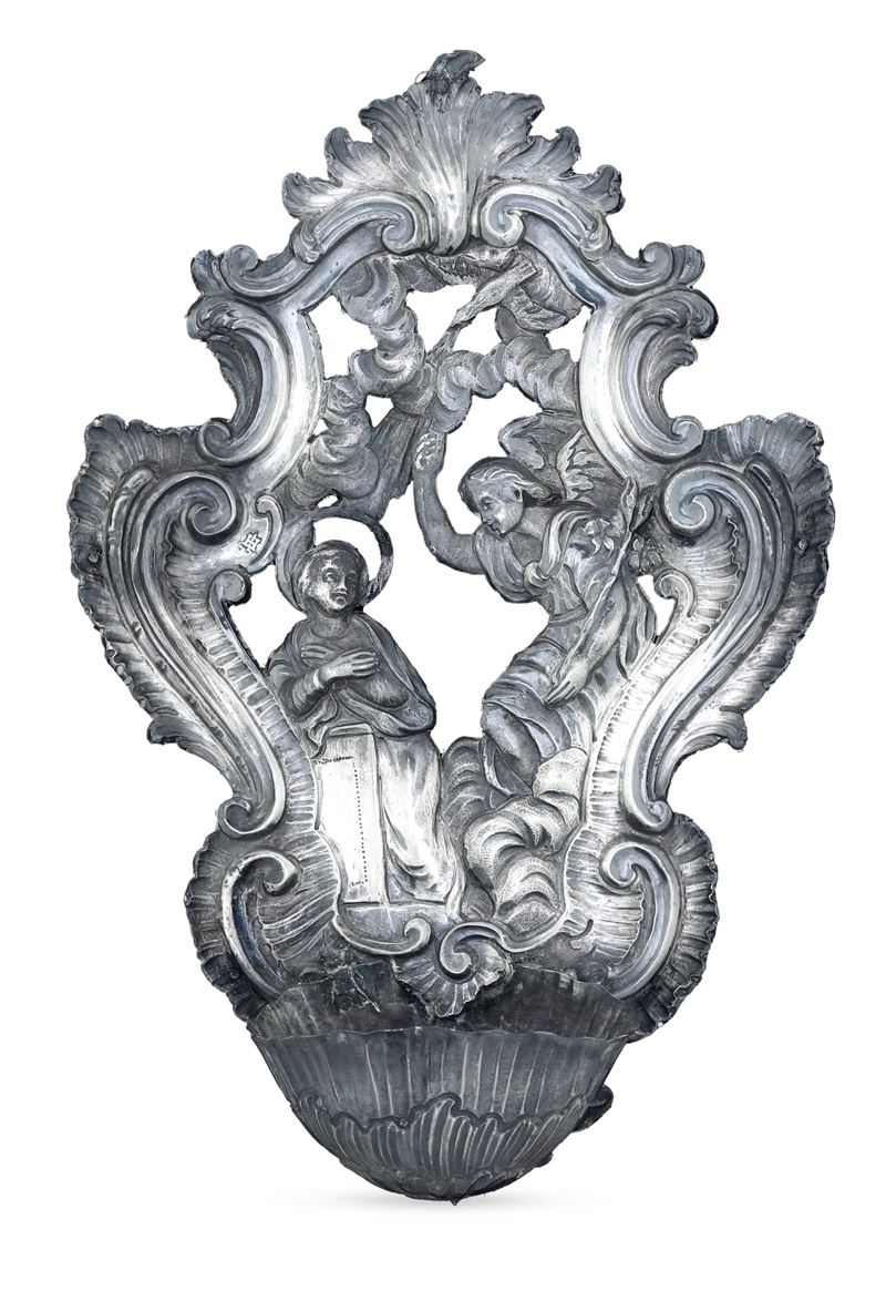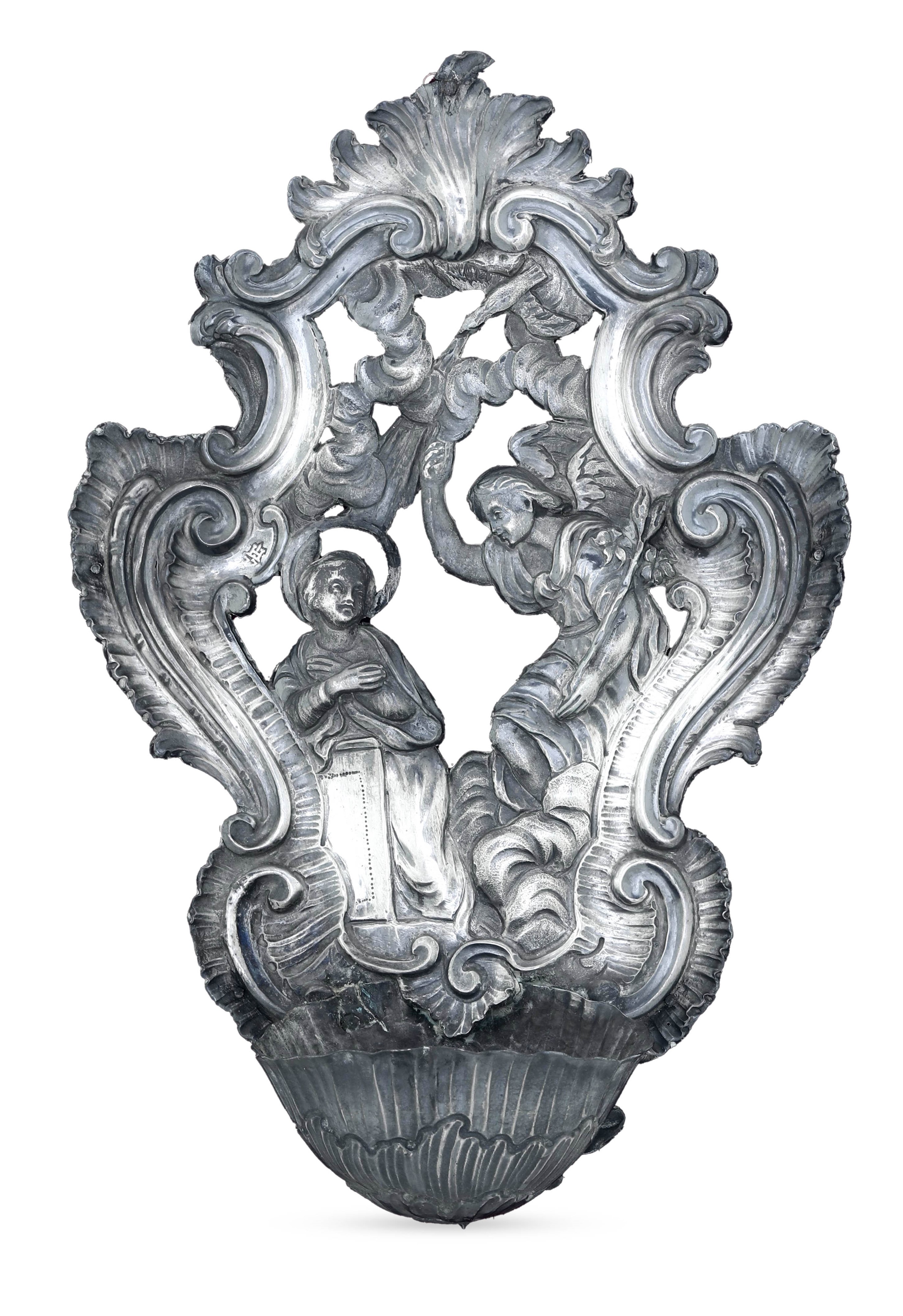 Acquasantiera con Annunciazione. Genova, marchio della "Torretta" per l'anno (17)77
