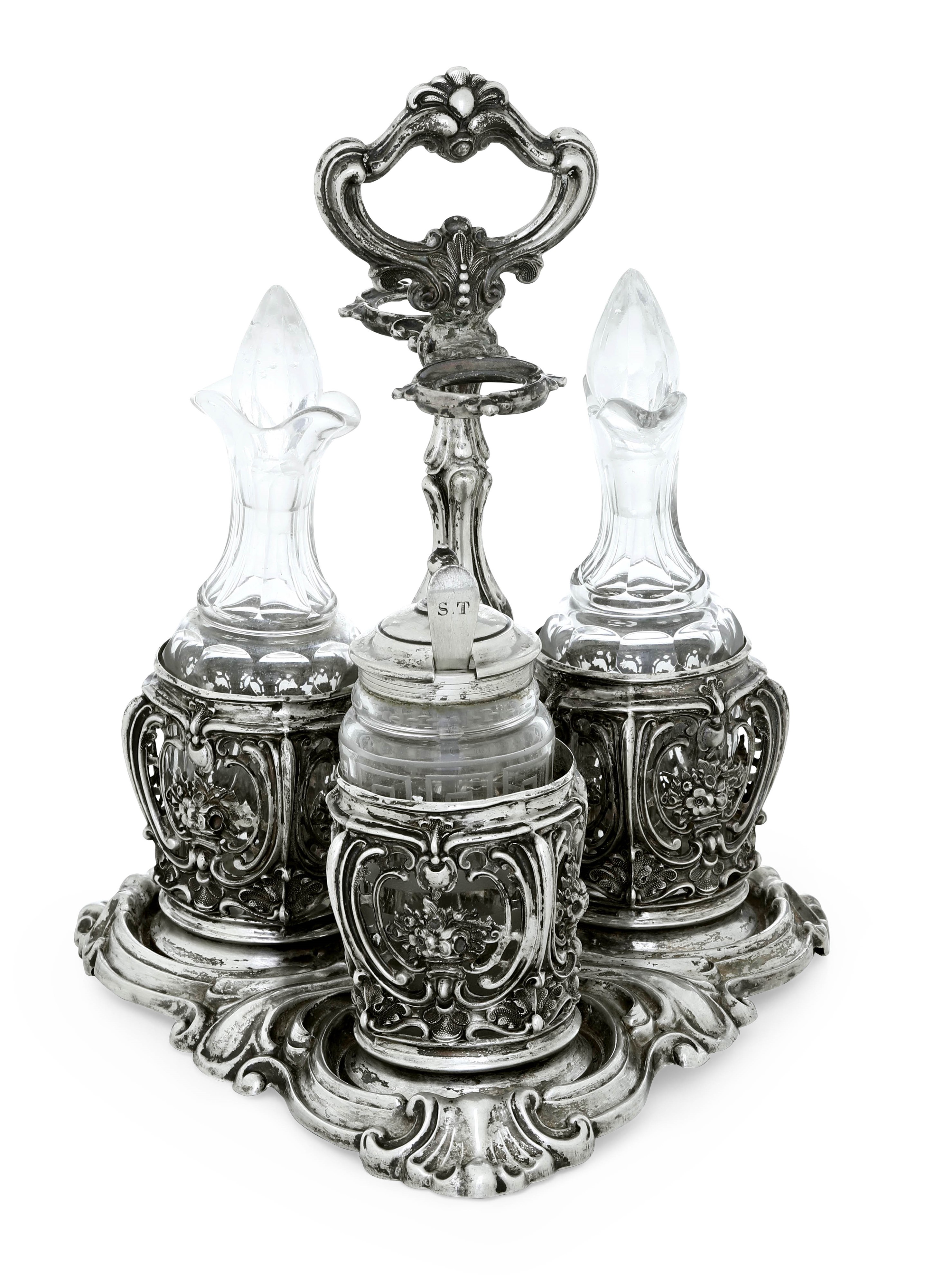 Argento fuso, sagomato e cesellato, ampolle in vetro