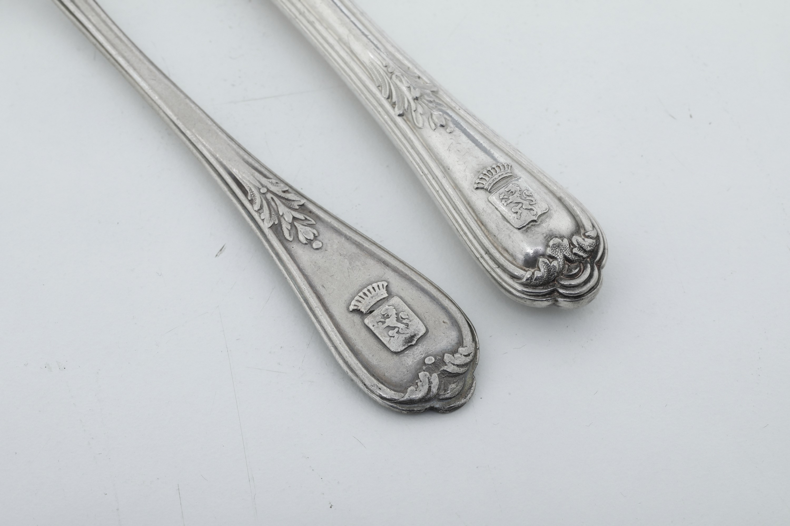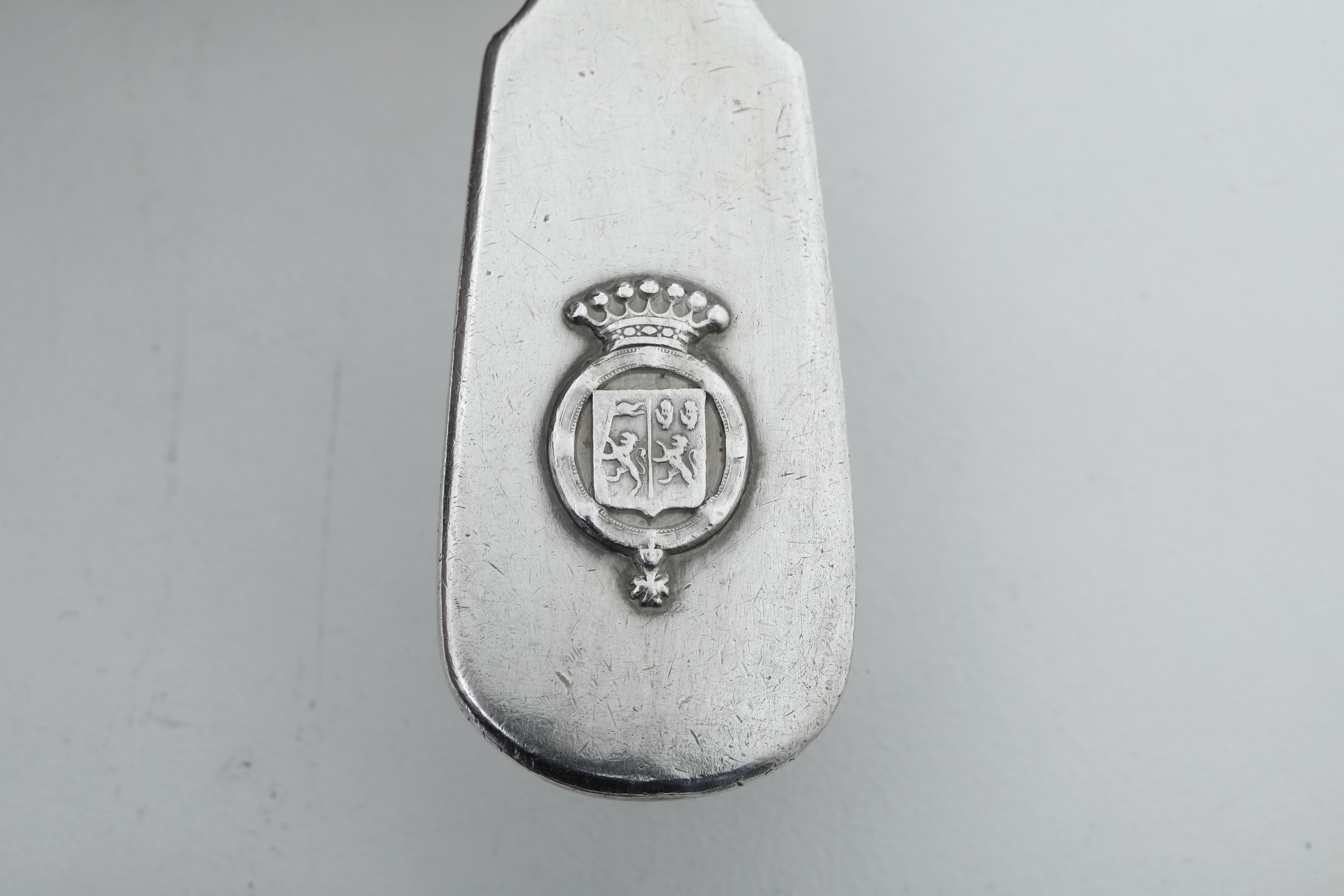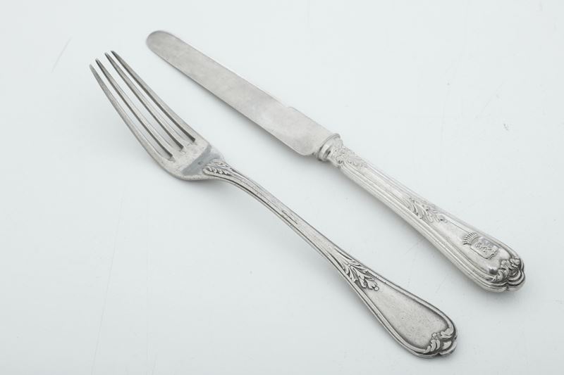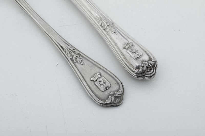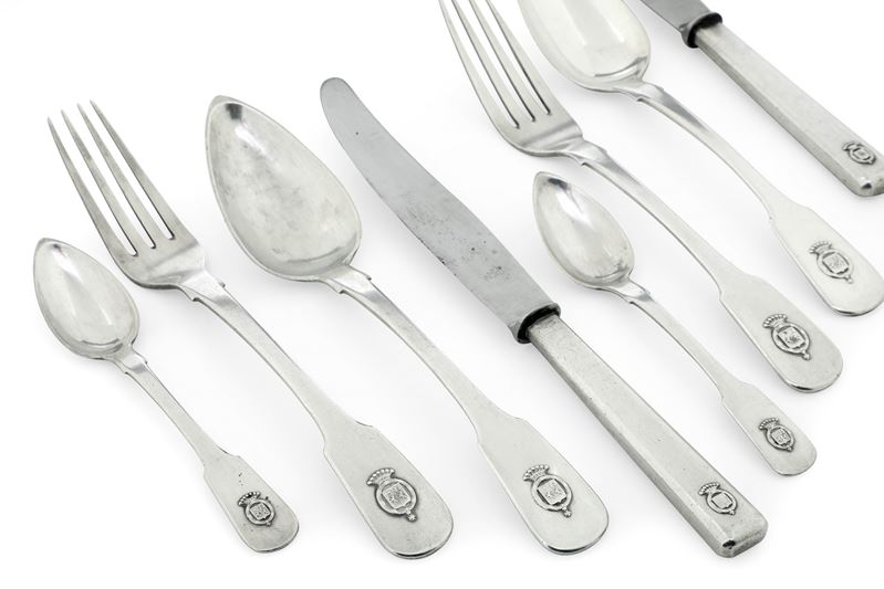 composto da 12 coltelli 12 cucchiai 13 forchette grandi 6 cucchiaini con stemma toscana inizi XIX secolo