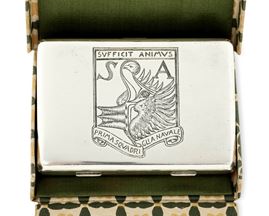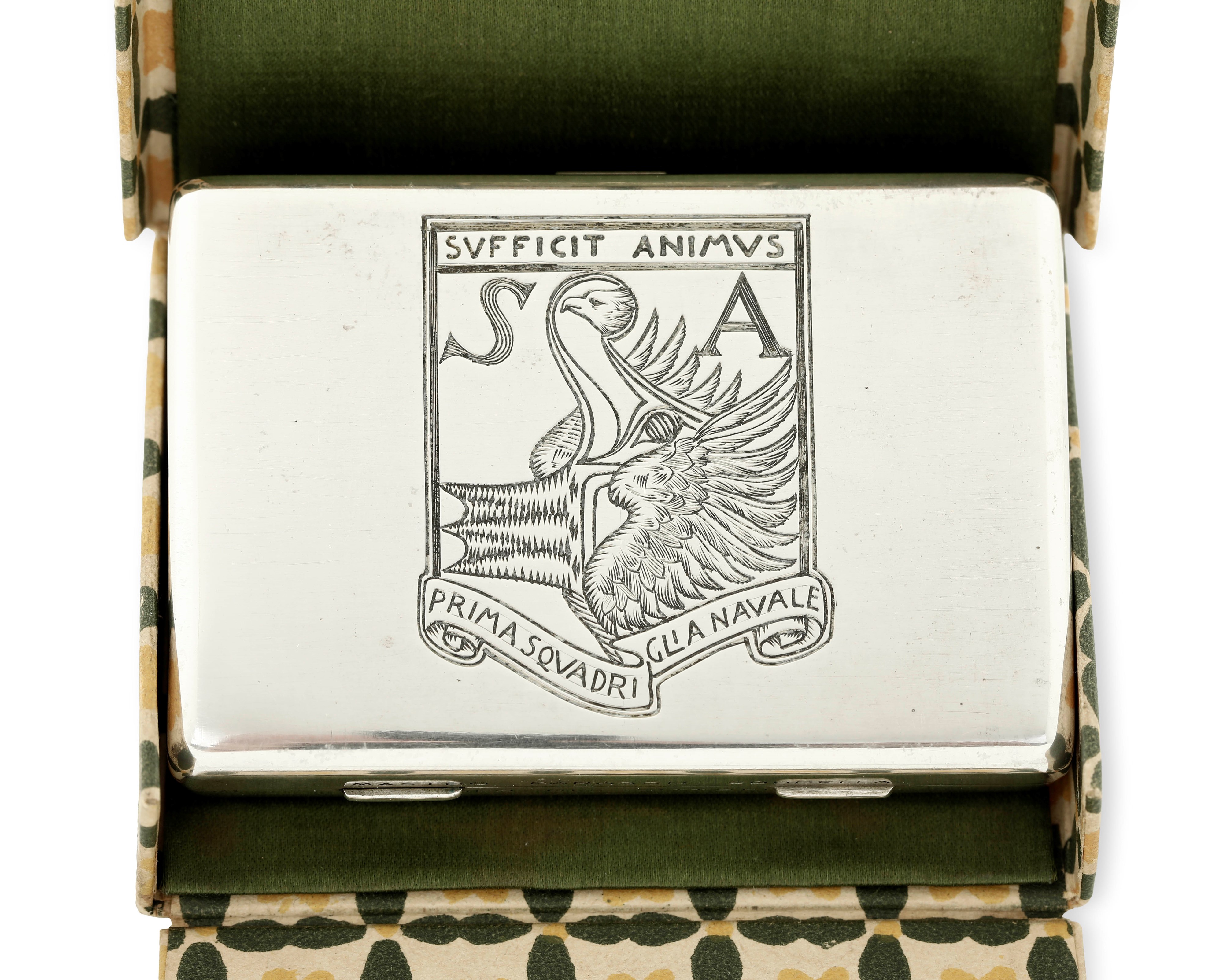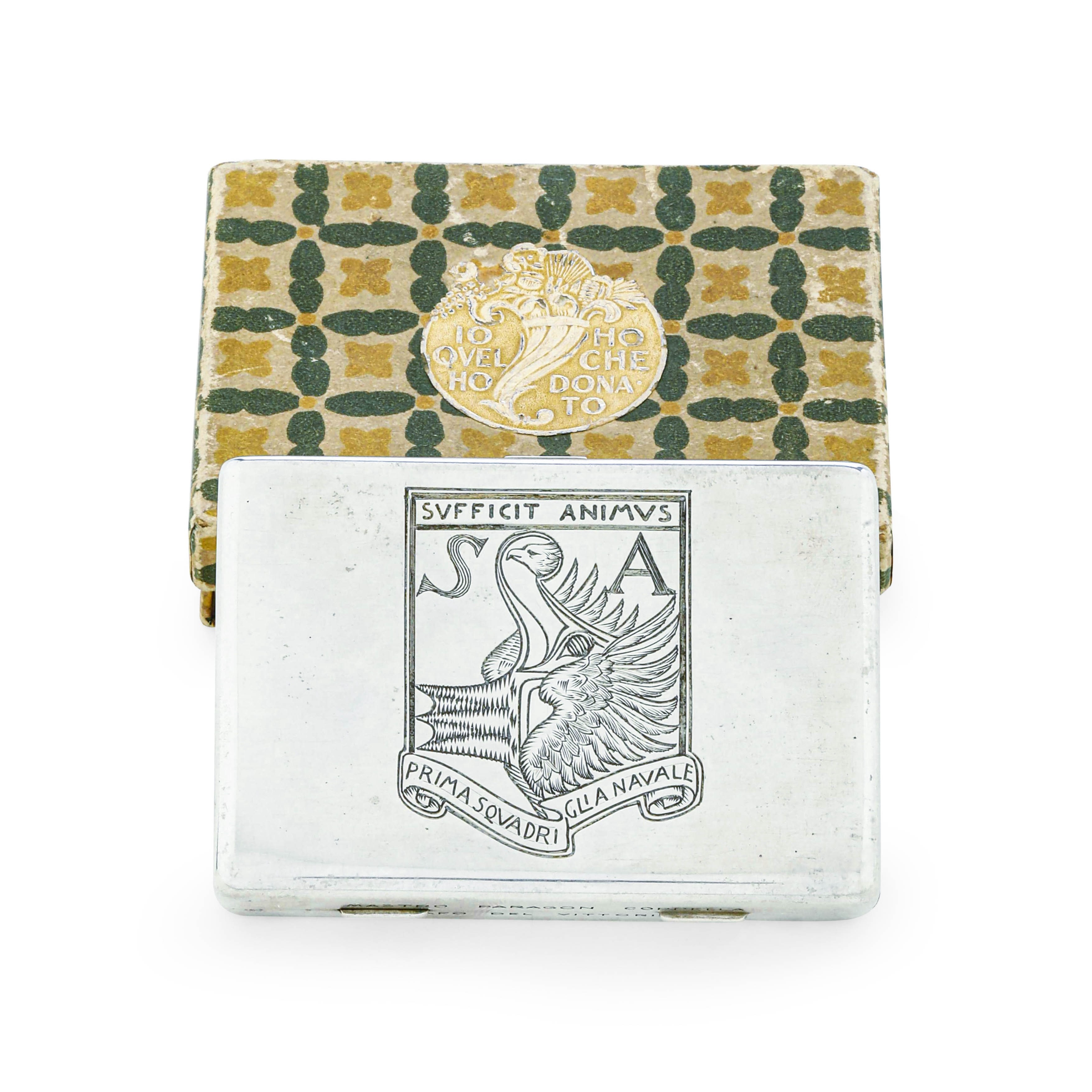 Quella qui presentata che reca sul coperchio il secondo emblema della prima squadriglia navale S.A. (Siluranti Aeree), disegnato da Adolfo de Carolis, raffigurante il rostro di una nave sorretto dalle ali di un’aquila sormontata dal motto in latino “Sufficit animus” (basta il coraggio) coniato dal vate che guidò come comandante la squadriglia dopo la sua formazione nel 1918.