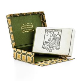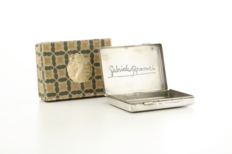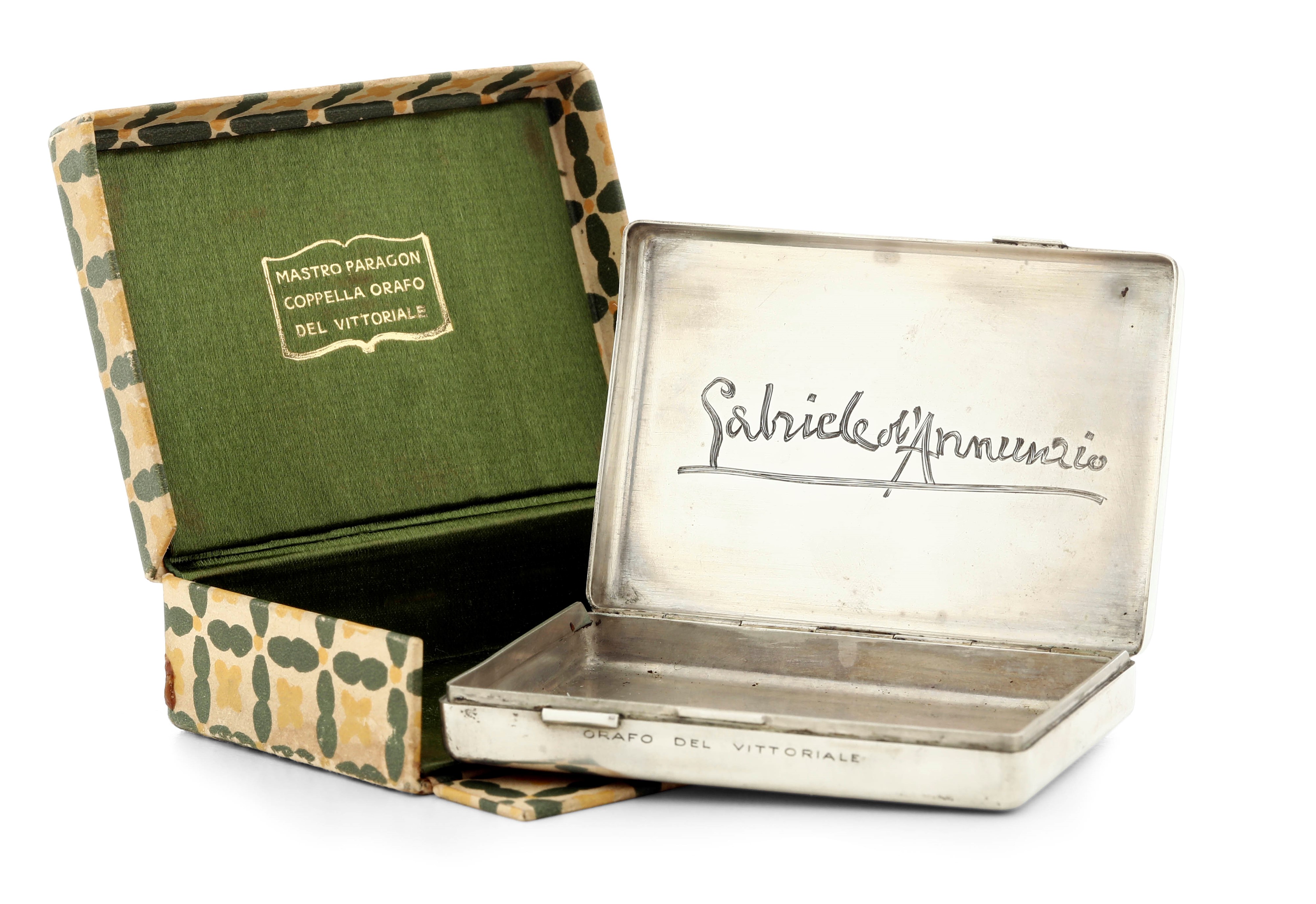 Sulla fascia frontale incisa la scritta: "orafo del vittoriale" e nella parte sottostante al coperchio incisa la firma "Gabriele D'Annunzio".