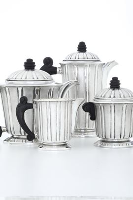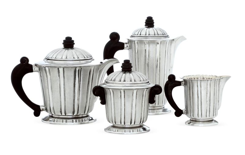 Servizio art decò. Argenteria artistica milanese del XX secolo, marchio con fascio littorio in uso dal 1935 al 1945. Argentiere Luigi Genazzi