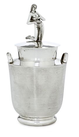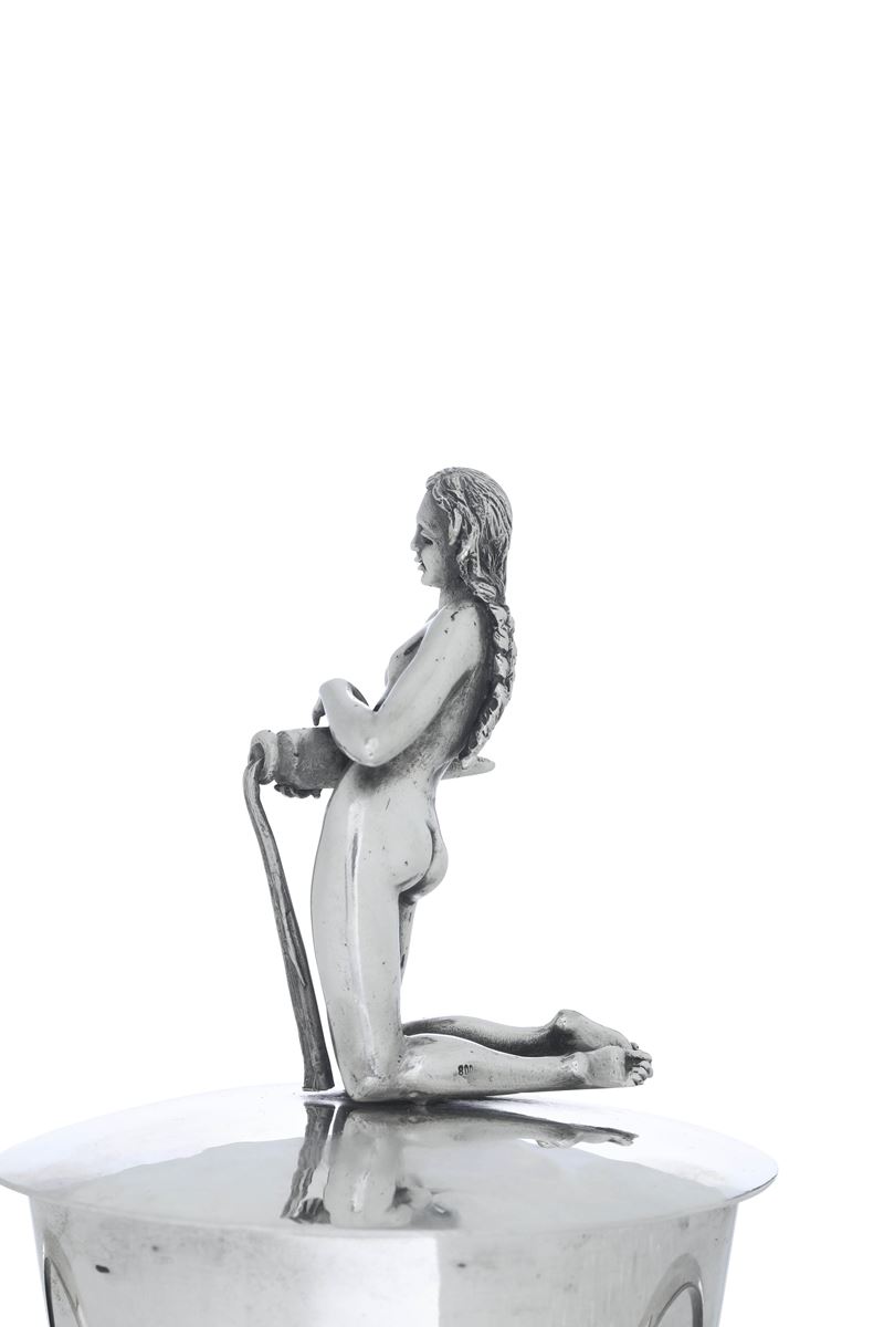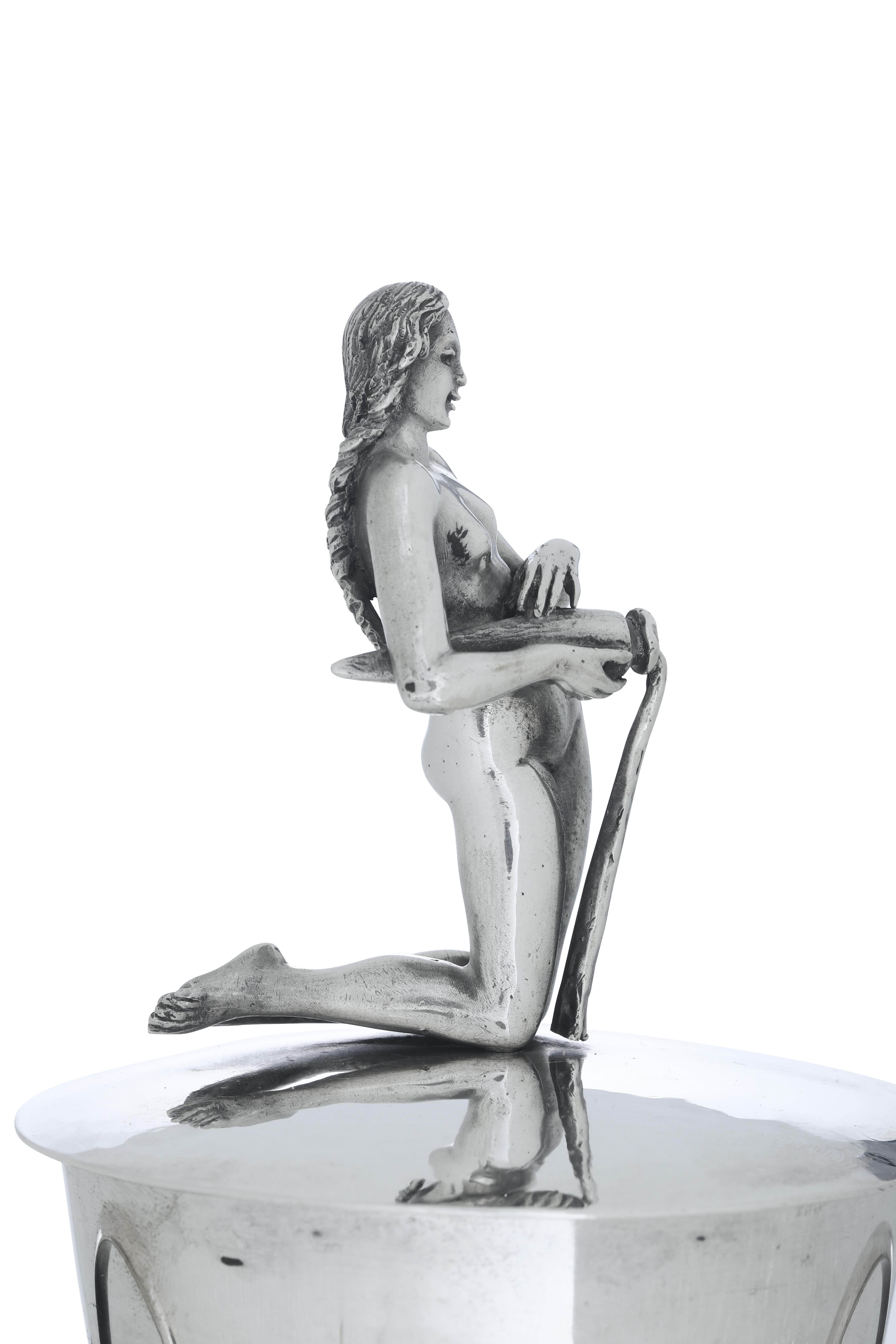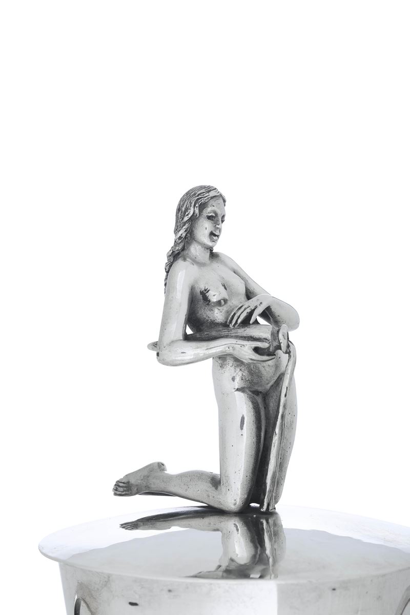 Ispirato agli argenti disegnati dall'architetto Guido Frette esposti alla VI Triennale di Milano del 1936 (sezione ENAPI). Elegante presa modellata con figura femminile del segno zodiacale dell'Acquario.