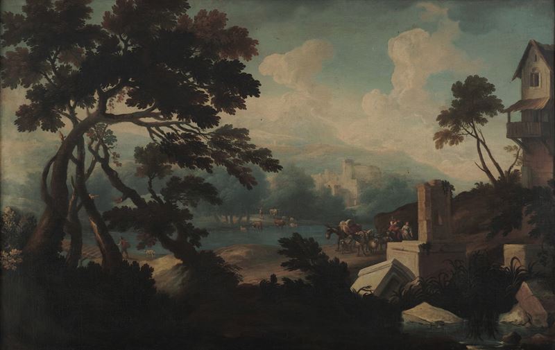 Scuola del XVIII secolo Paesaggio fluviale con rovine e viandanti