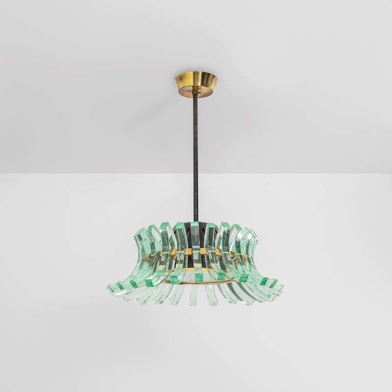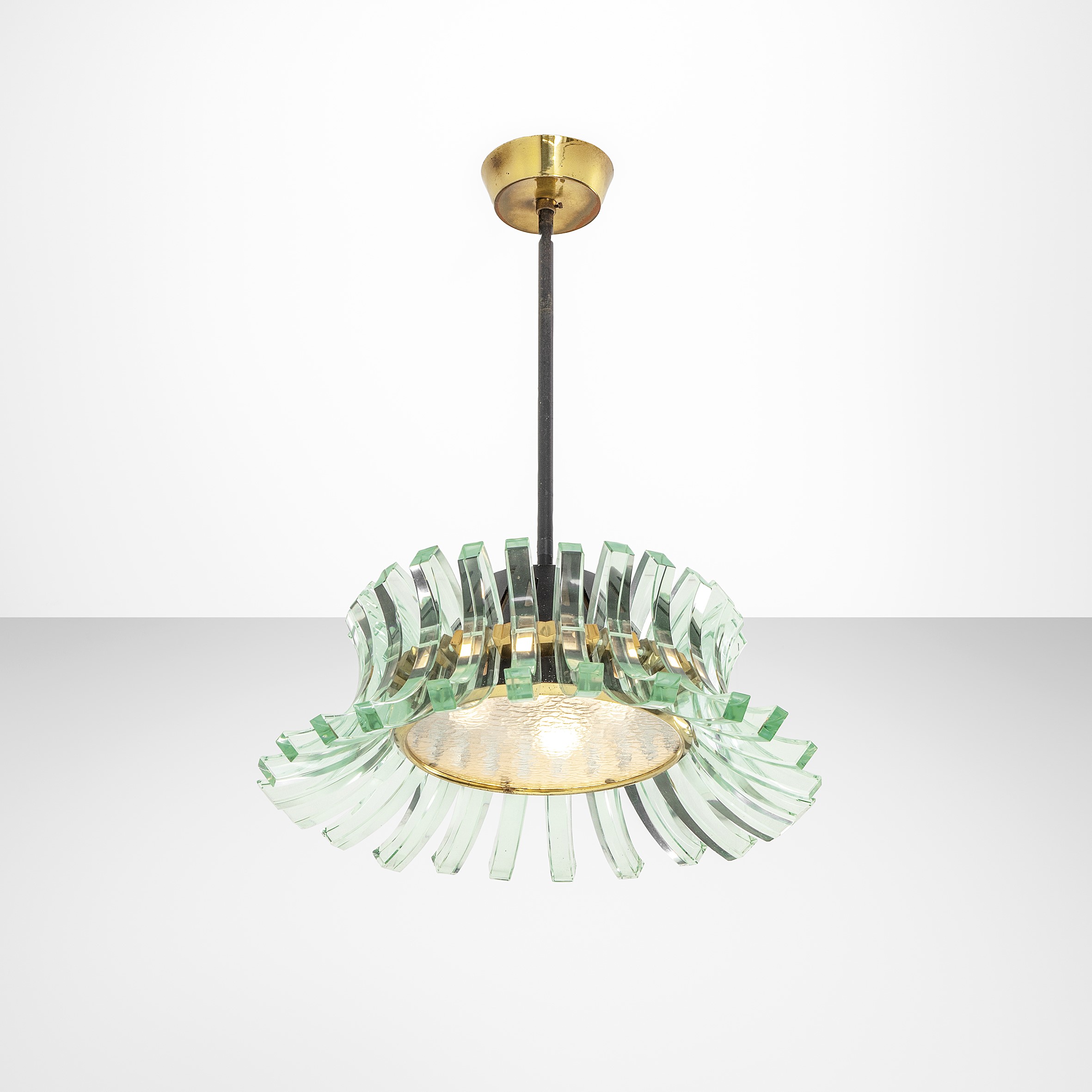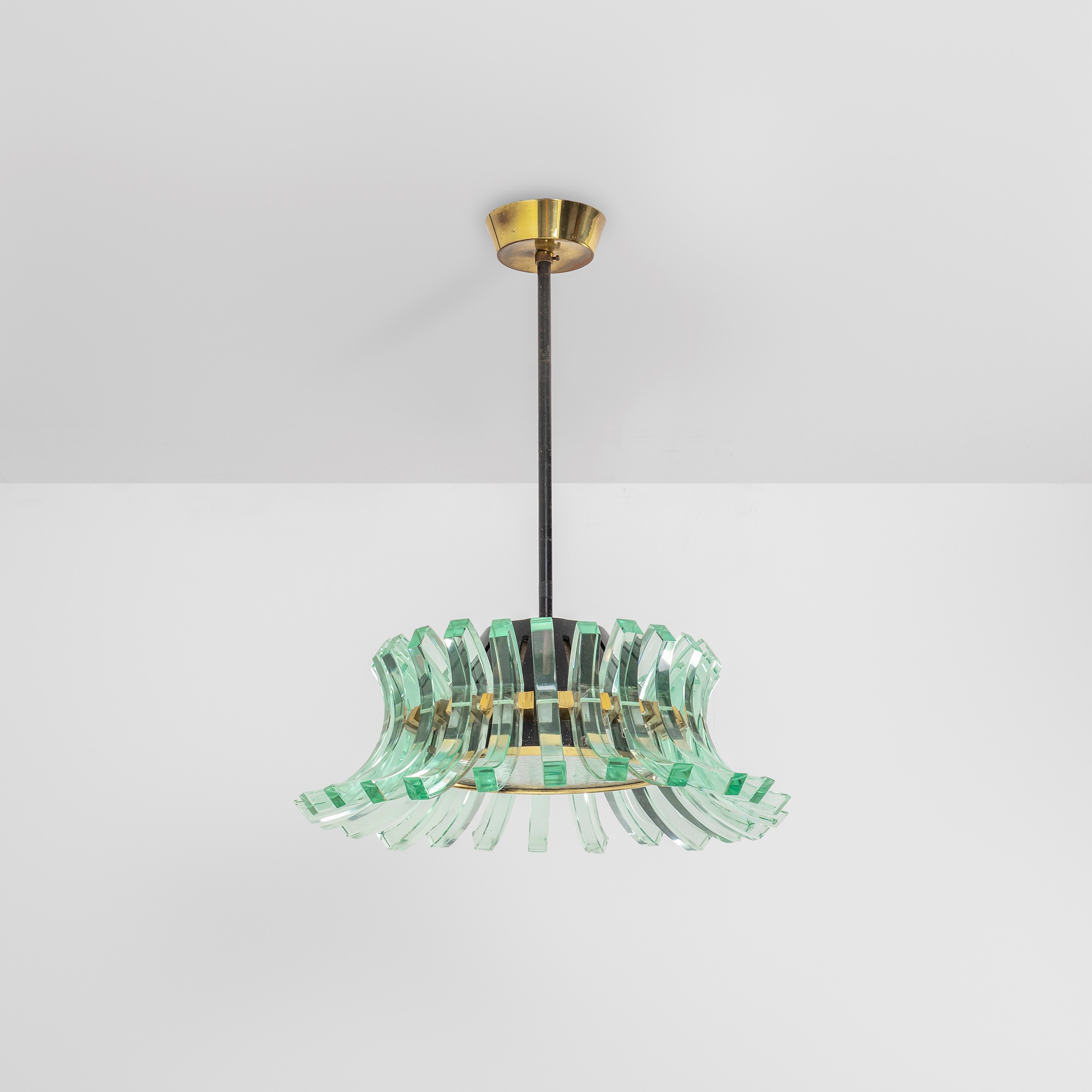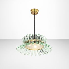 Struttura in ottone, cristalli sagomati e molati e diffusore in cristallo satinato.