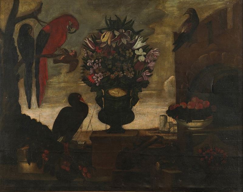 Scuola del XVIII secolo Paesaggio con composizioni di frutti e fiori e volatili