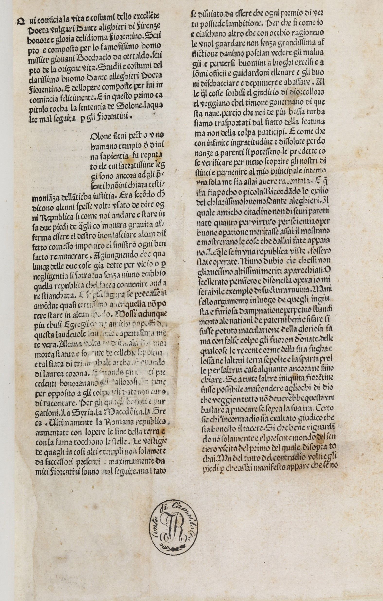 In-folio (mm 309x190). [371] cc. (di 375). Bella rilegatura di gusto romantico con ricche decorazioni a fregio e in oro ai piatti e al dorso. Tagli rossi. (cerniera del piatto anteriore internamente molto fragile con rottura). Esemplare fresco e marginoso con alcuni restauri, per li più interessanti i bordi bianchi, e rari strappi senza perdite di testo.